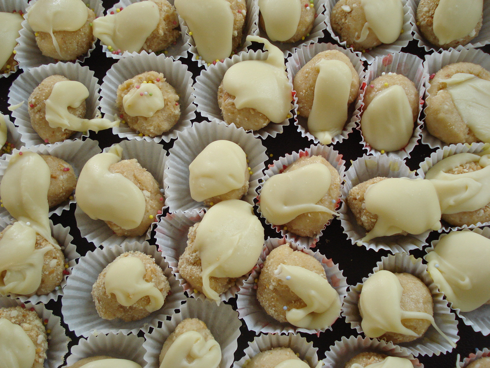 Ralam-se as bolachas na picadora e misturam-se com o queijo, de seguida moldam-se pequenas bolinhas que se colocam nas forminhas de papel frisado, de seguida derrete-se o chocolate branco no micro-ondas e coloca-se por cima das bolinhas, para decoração polvilham-se com missangas coloridas, a seguir colocam-se no frigorífico.