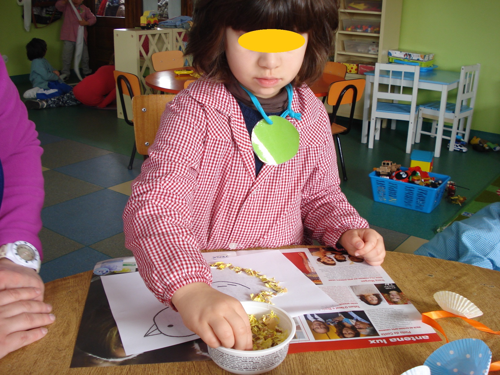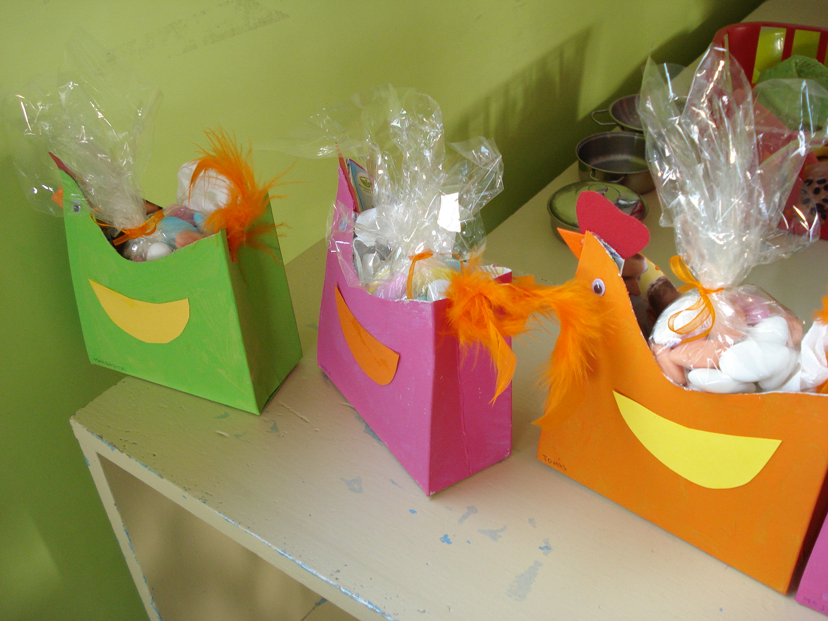 A Páscoa estava para chegar e resolvemos fazer uma galinha, partindo de uma caixa de papa de bebé, pintamo-la com a cor que quisemos, colocamos-lhe os olhos, o bico, a crista, as asas e umas penas no rabo, lá dentro tinha amêndoas e uns bolinhos feitos por nós, cá vai a receita.