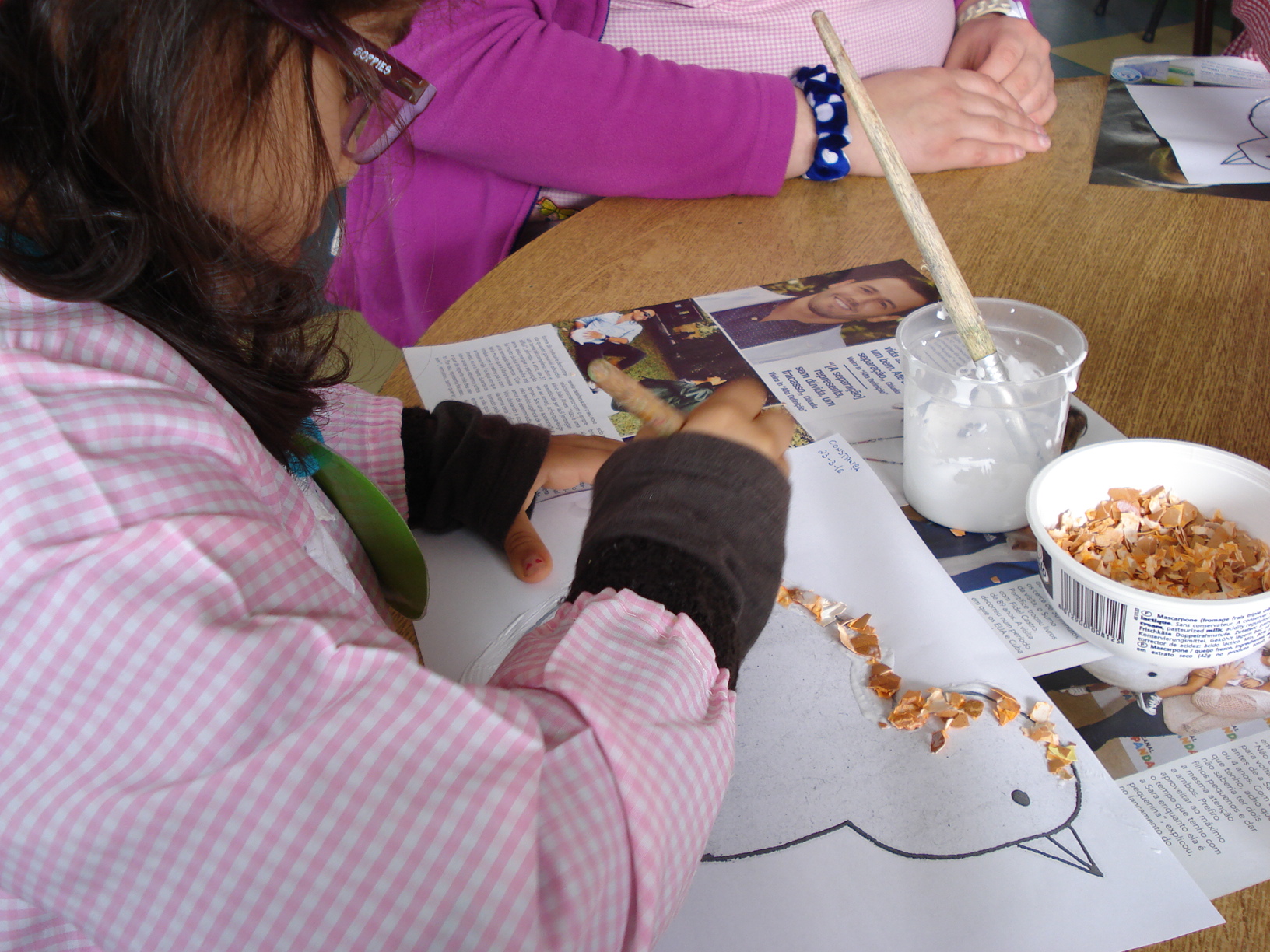 Fizemos um trabalho de colagem de cascas de ovos pintadas, este consistia em contornar um pinto com as cascas partidas em pedacinhos muito pequeninos. Temos ouvido e contado muitas histórias acerca destes temas e aprendemos canções novas.