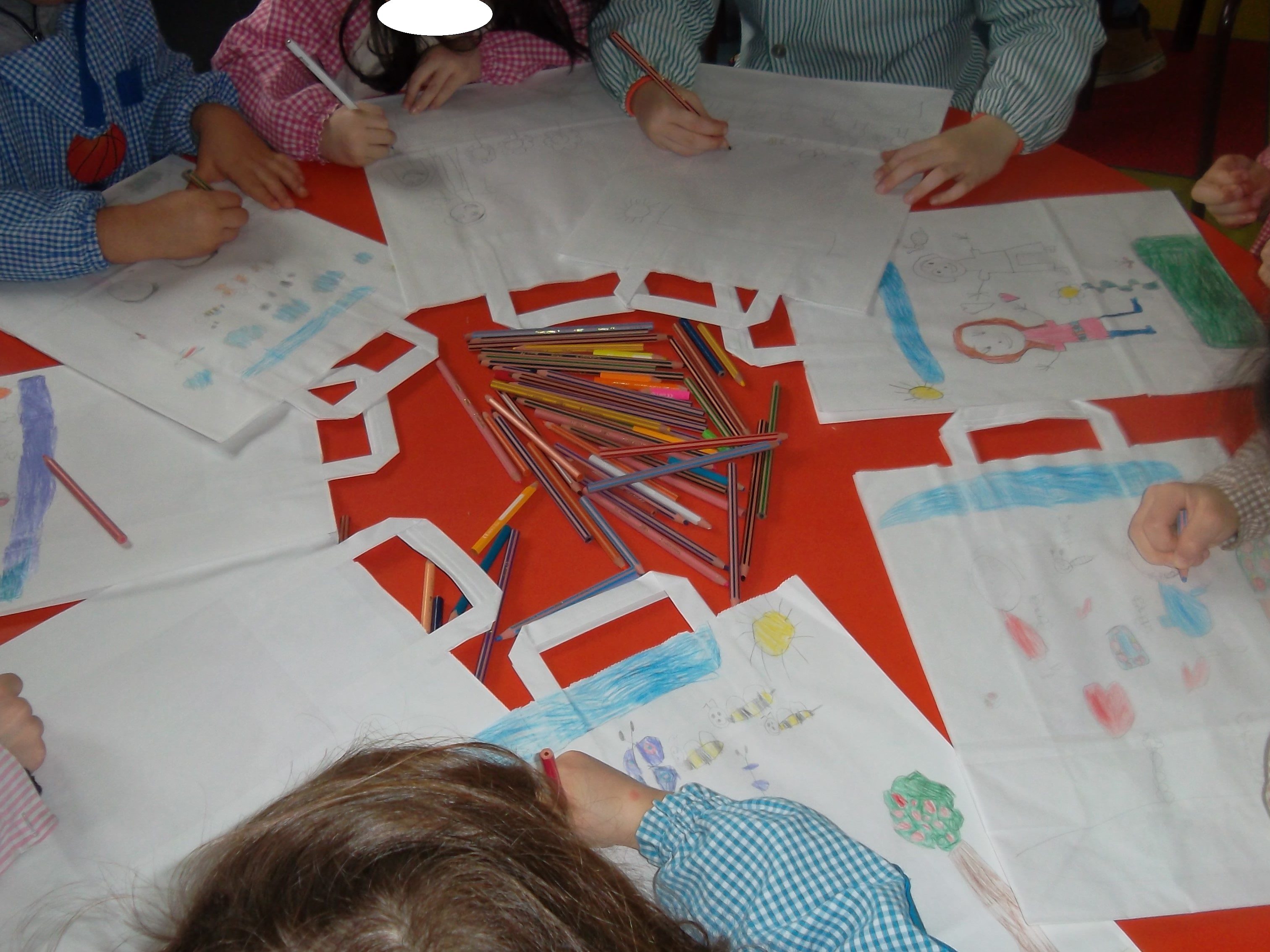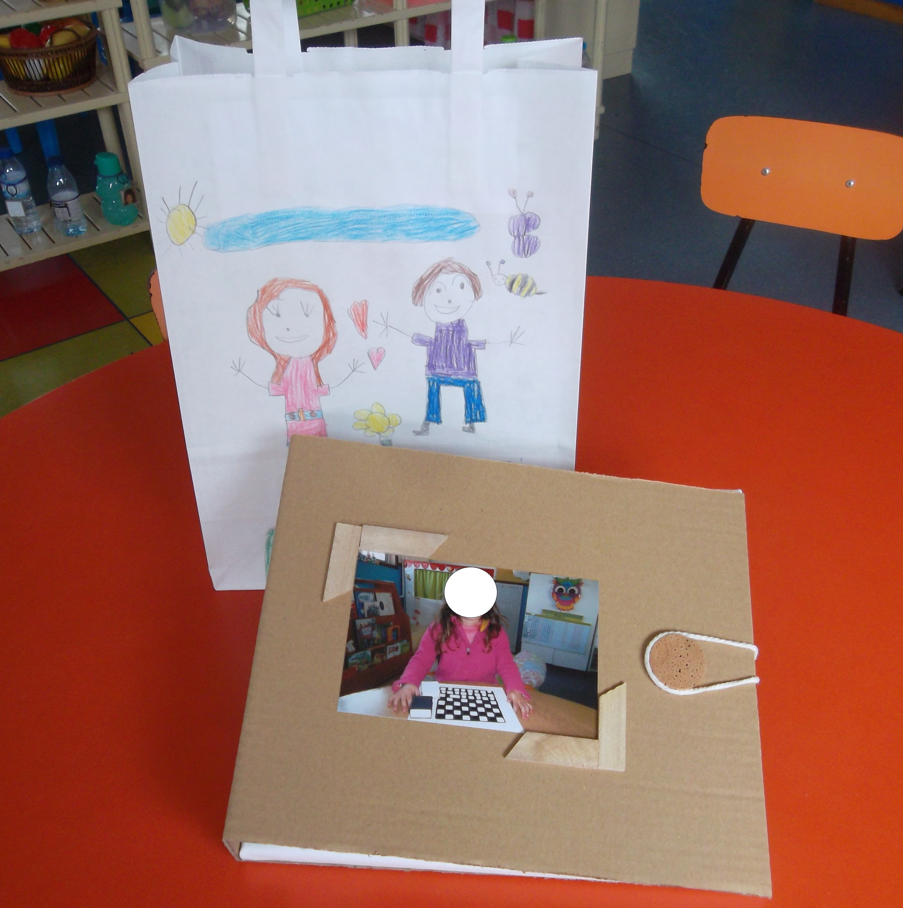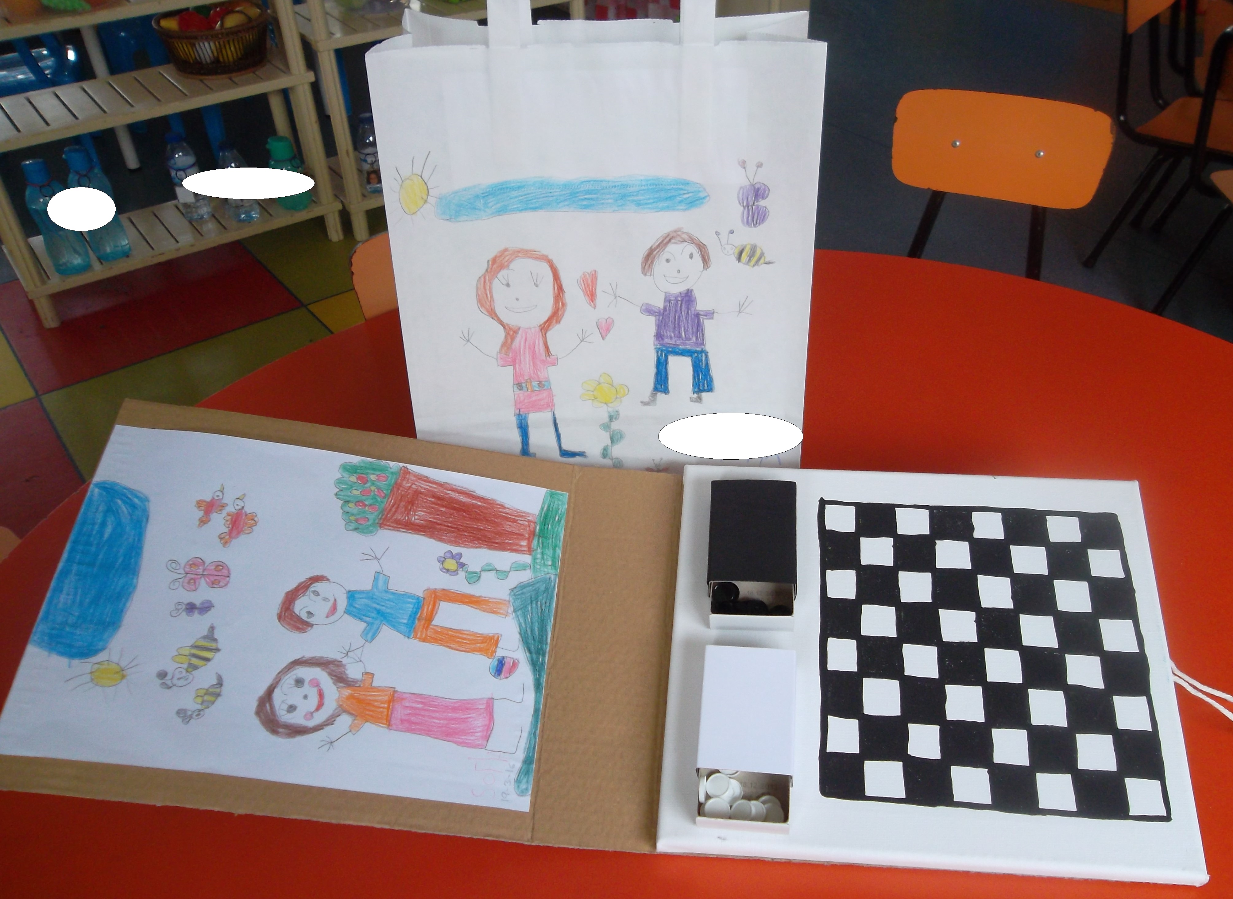 Numa folha de papel cada criança desenhou o que mais gosta de fazer com o seu pai e para decorar o saco cada criança desenhou-se com o seu pai e na capa colámos uma fotografia como que a convidar a jogar. E foi assim que a nossa prenda ficou.