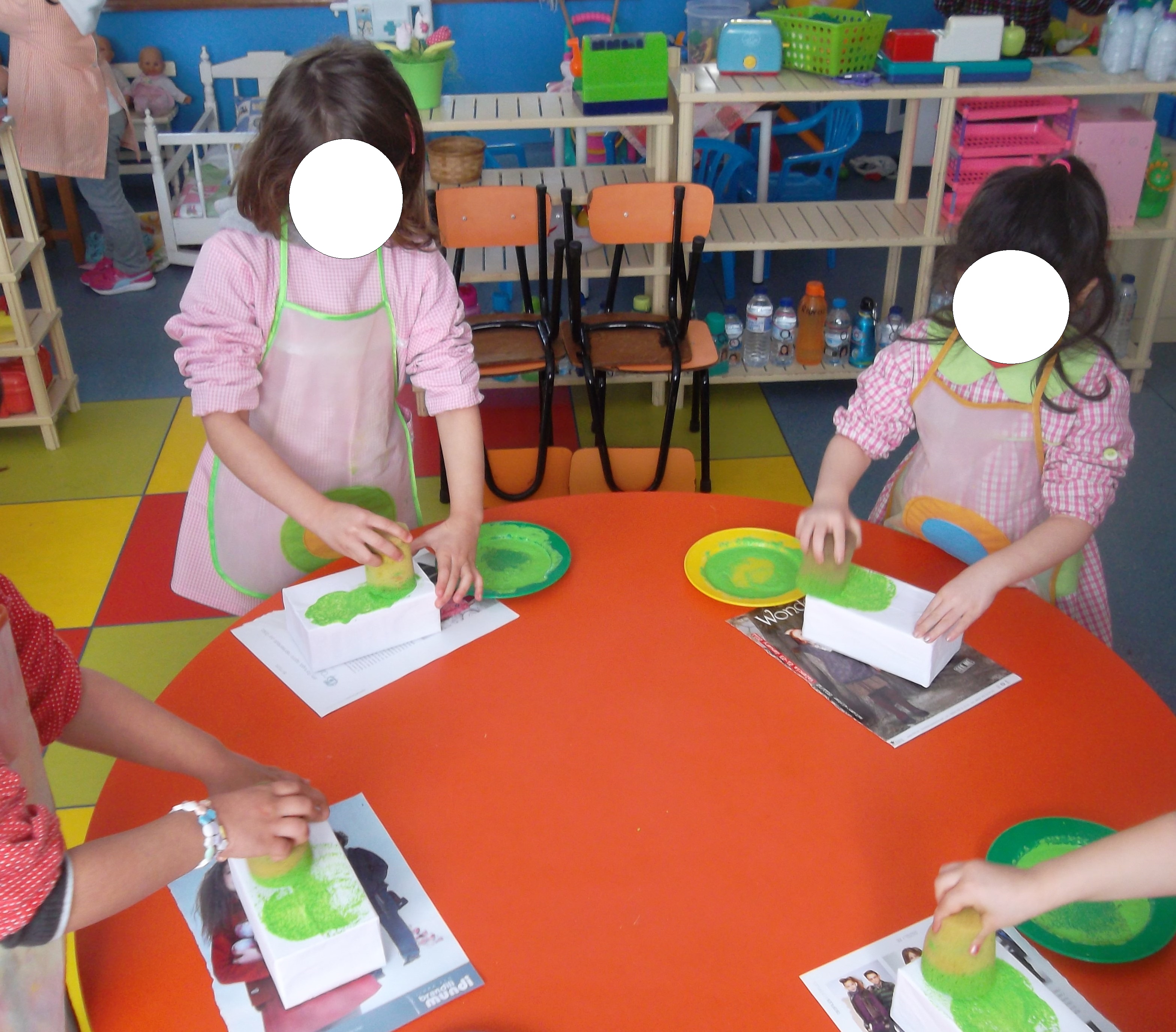 De seguida enchemos as garrafinhas de plástico com pasta de enchimento e pintámos os pacotes de leite (depois de os forrarmos com uma folha de papel branco) de verde com esponjas e por fim colámos as cancelas e as relvas.