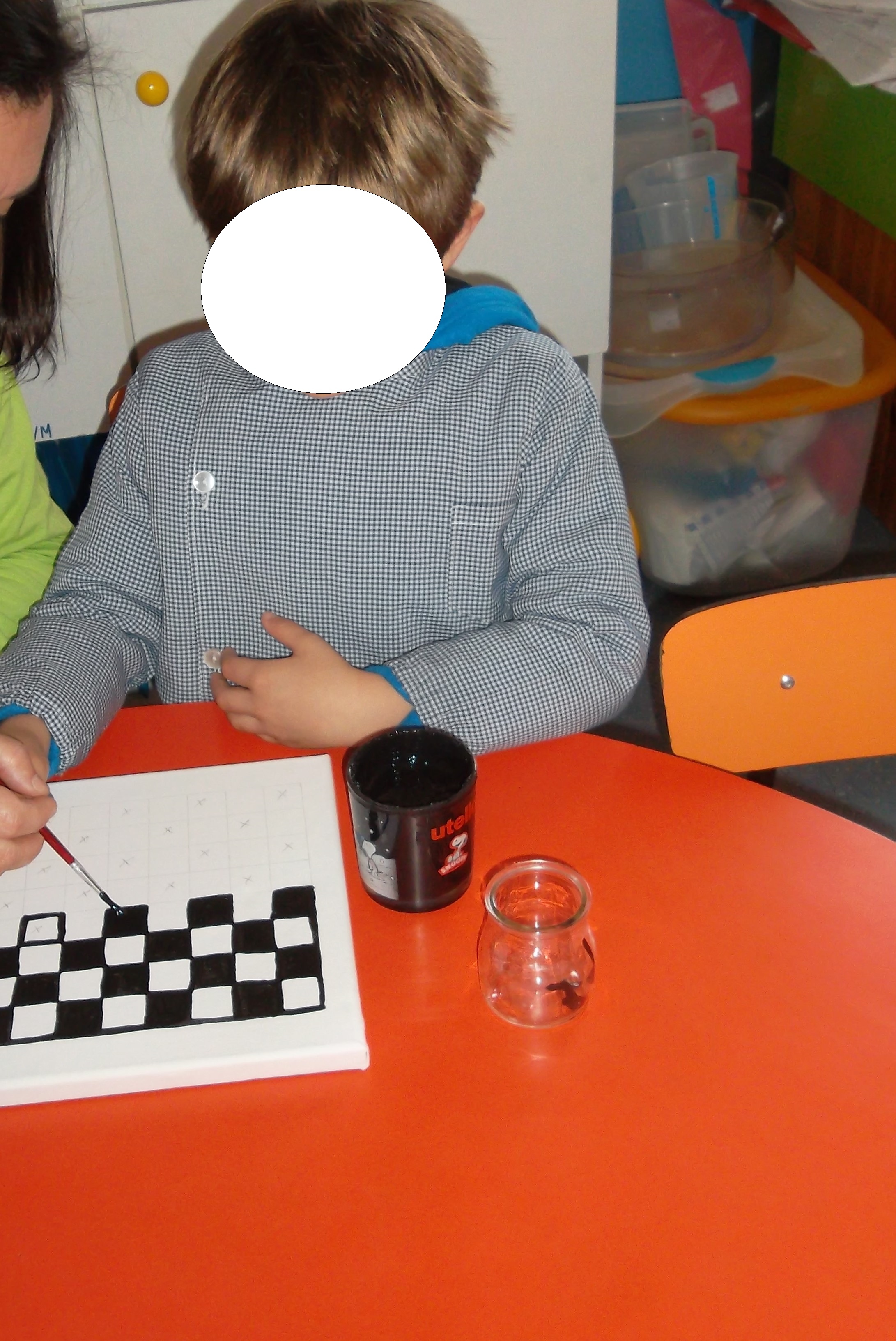 Pintámos numa tela os quadrados do tabuleiro com a ajuda da Ana Paula e com caixas de fósforos, tampinhas de frascos, cartão e rolhas de cortiça construímos o nosso jogo.
