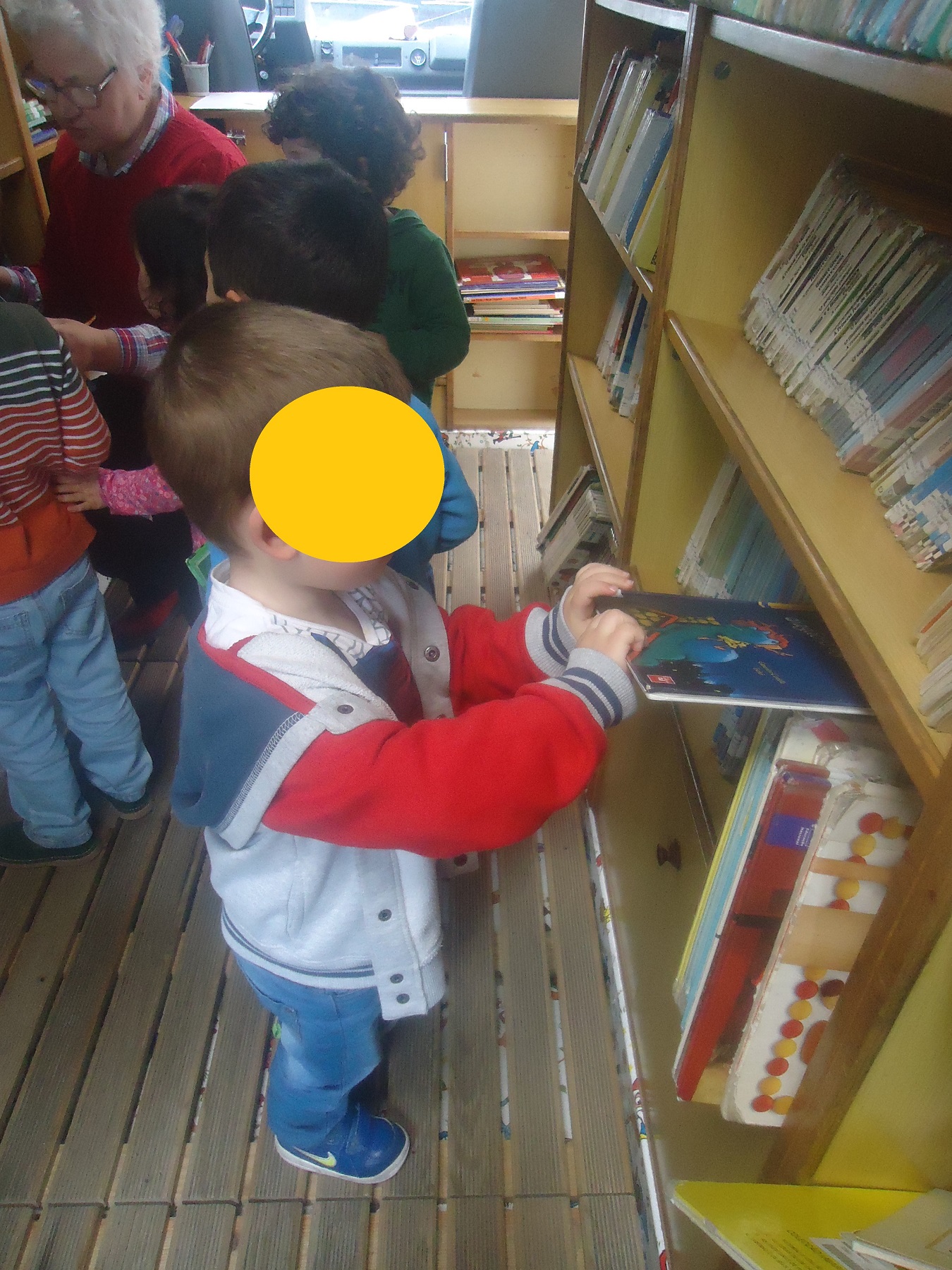 Uma outra atividade que para nós foi diferente, foi a ida ao autocarro da biblioteca de Aveiro requisitar histórias, entramos cinco de cada vez para possibilitar a livre circulação e escolha dos livros.