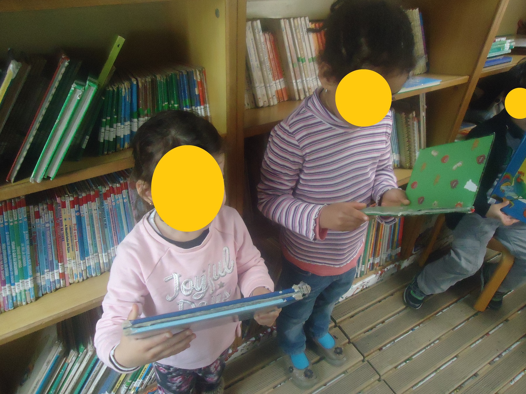 Tornou-se engraçado porque a Márcia em sala falou-nos das regras a cumprir e uma delas era não mexer nos livros…então fizemos exatamente o que ela pediu, a senhora insistia para que mexêssemos e nós nada! Então a Márcia informou-nos que a partir daquele momento já o poderíamos efetuar a seleção das histórias.