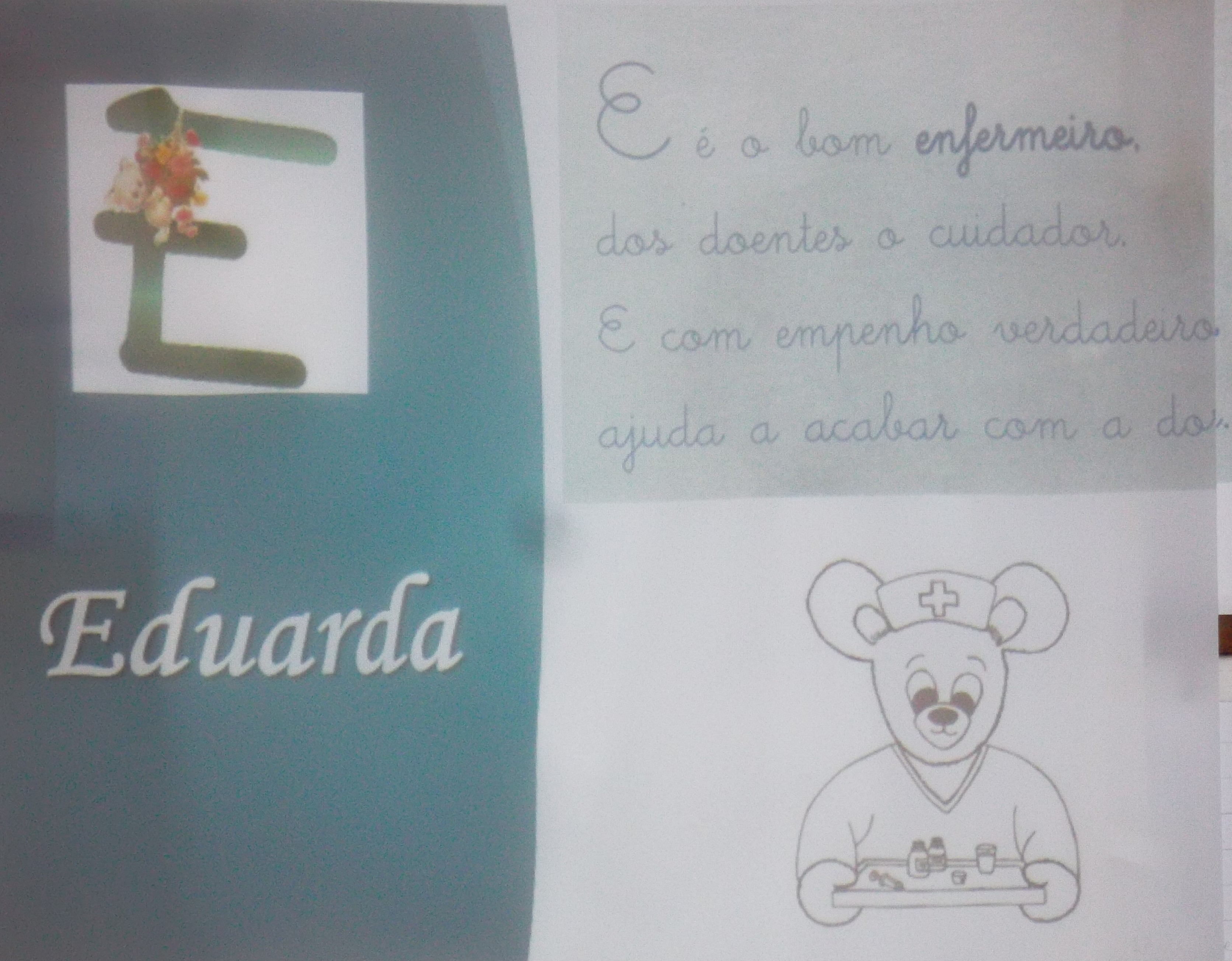 Através dos nomes das crianças da sala a mãe da Joana foi dando a conhecer quais as funções e importância dos vários constituintes do hospital e ao chegar ao “E” de enfermeira uma das crianças do grupo sugeriu que a ursinha enfermeira do livro se chama-se “Urcinda”, uma vez que a mãe se chama Lucinda e é enfermeira do hospital.