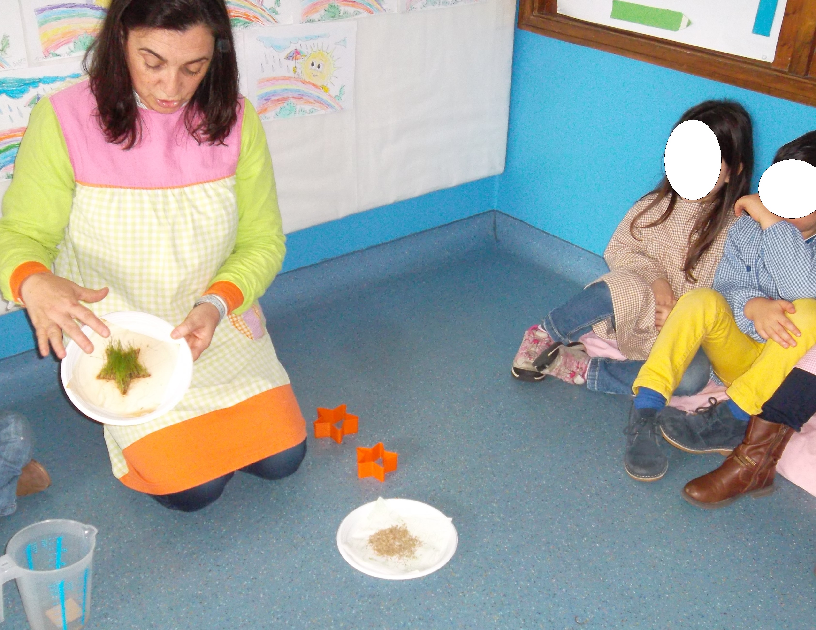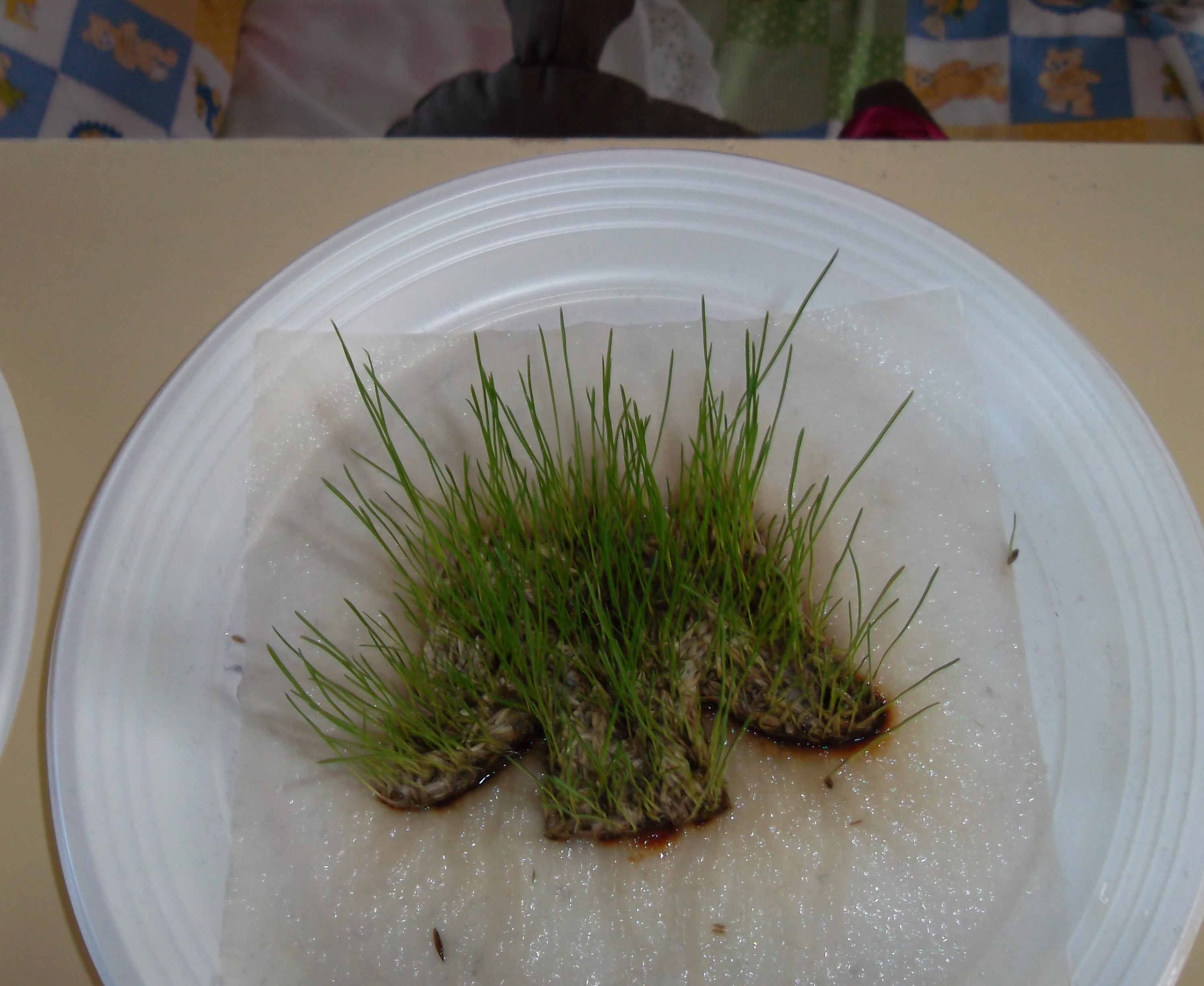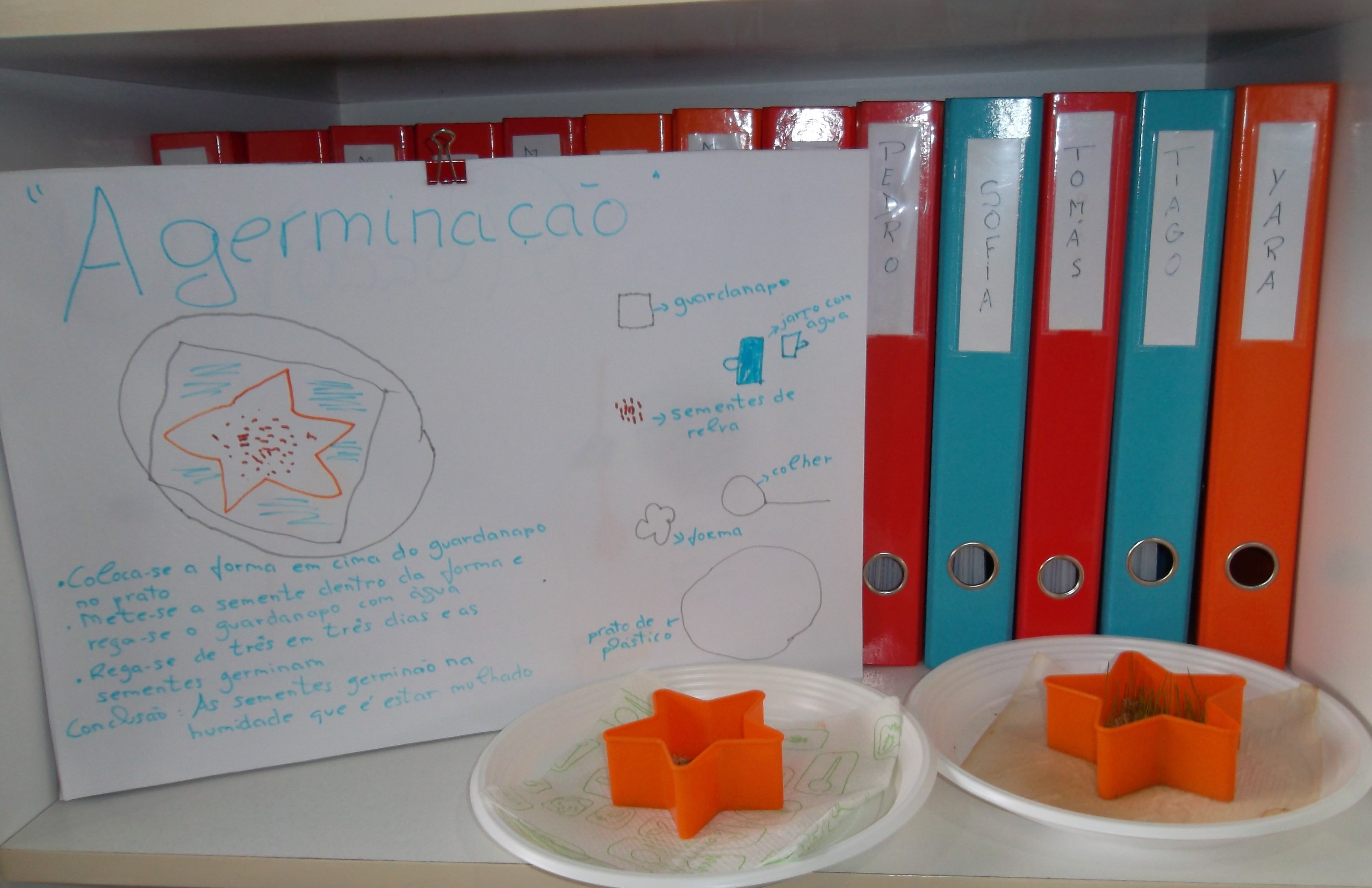 Apesar do tempo não mostrar muito a mudança de estação, a Primavera chegou e resolvemos fazer uma experiência ligada à germinação, na qual se demonstra a necessidade da humidade para que as sementes germinem. Colocámos guardanapos de papel em cima de um prato de plástico, colocámos uma forma de cortar massa em cima e dentro colocámos sementes de relva. Regámos o guardanapo e esperámos uns dias.