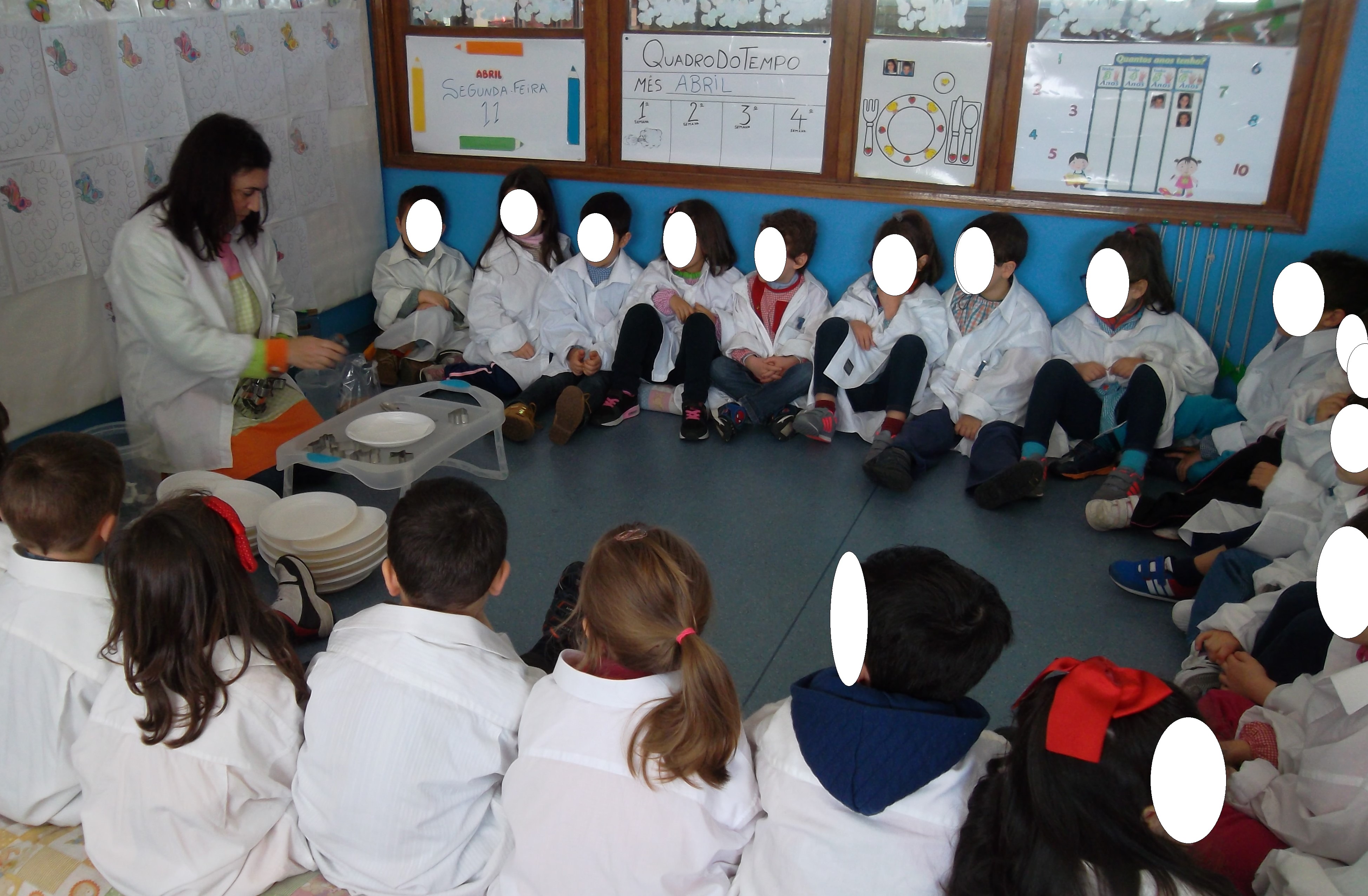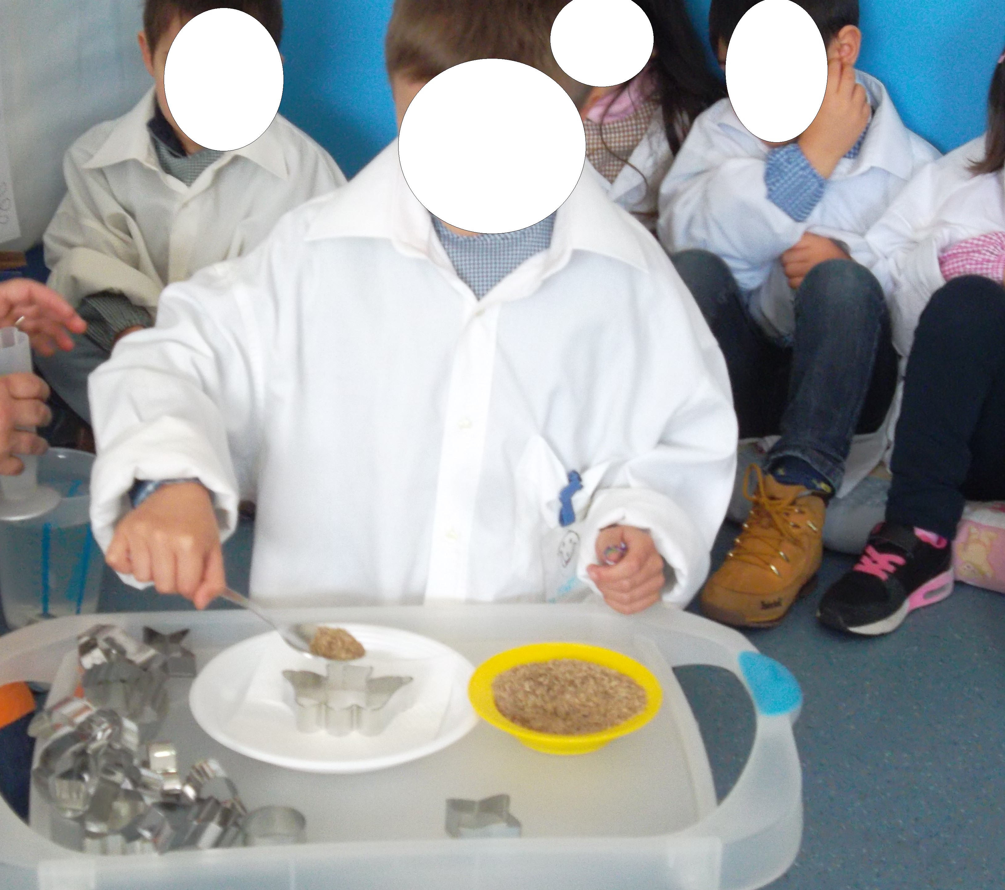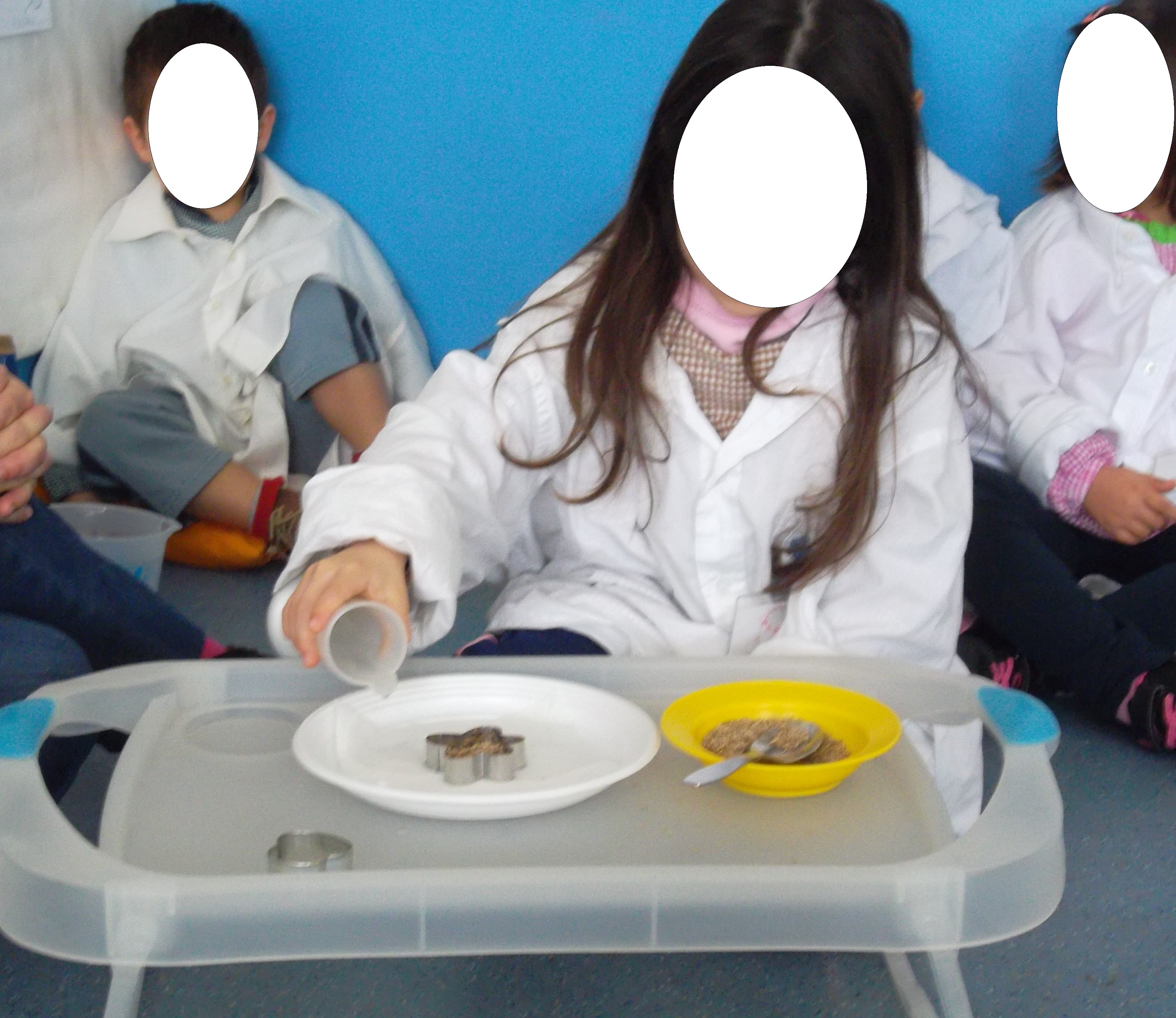 Apesar do tempo não mostrar muito a mudança de estação, a Primavera chegou e resolvemos fazer uma experiência ligada à germinação, na qual se demonstra a necessidade da humidade para que as sementes germinem. Colocámos guardanapos de papel em cima de um prato de plástico, colocámos uma forma de cortar massa em cima e dentro colocámos sementes de relva. Regámos o guardanapo e esperámos uns dias.