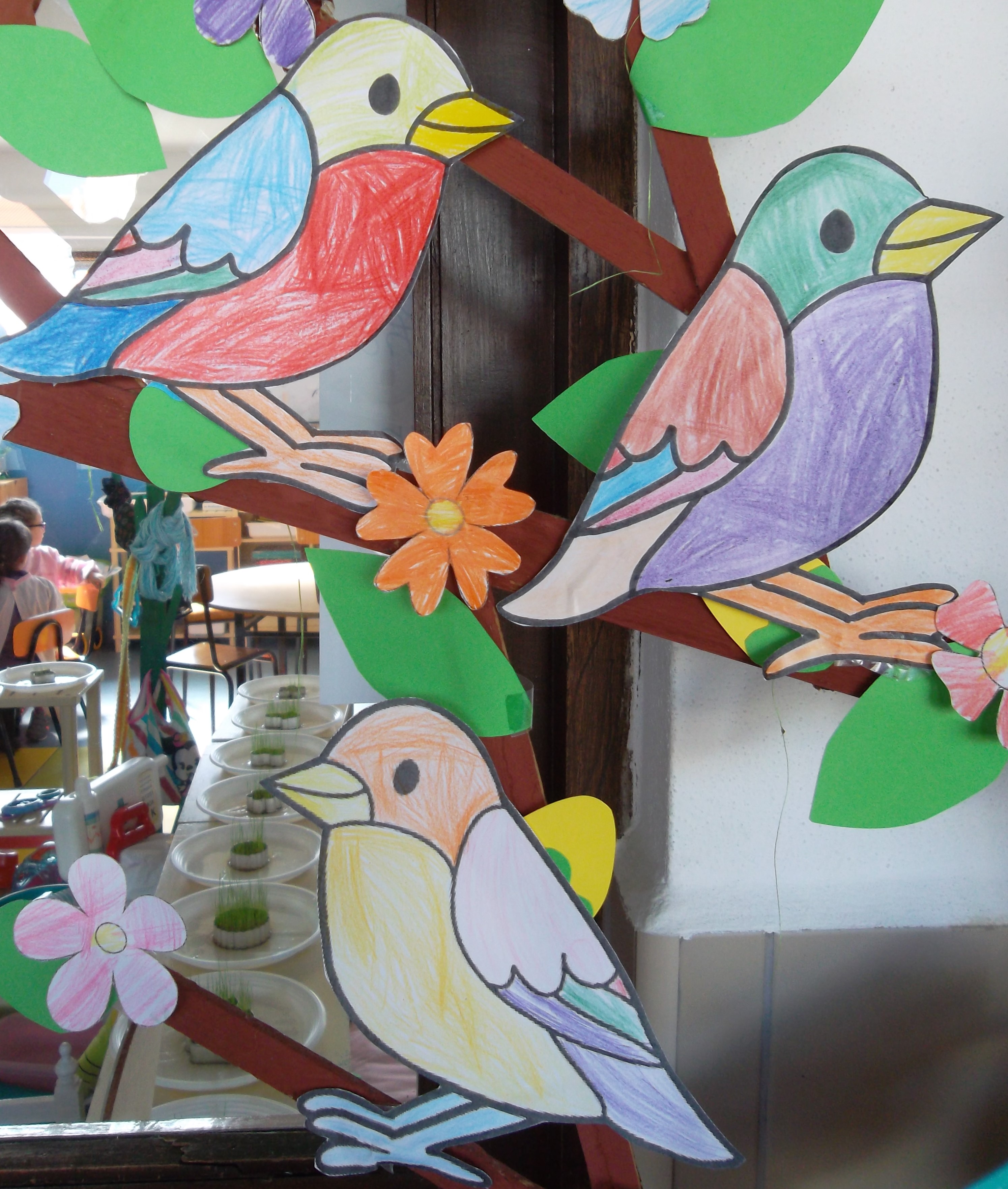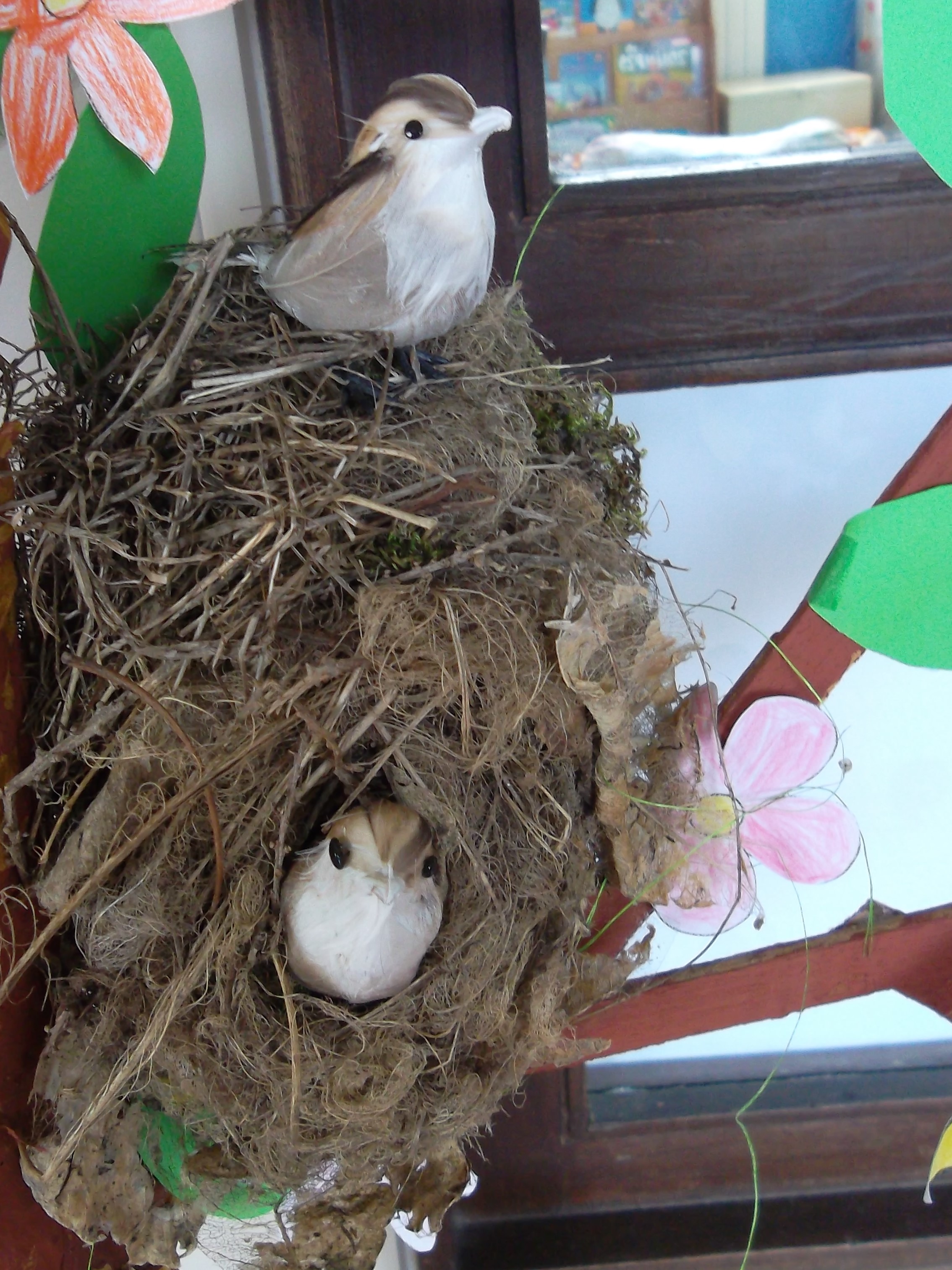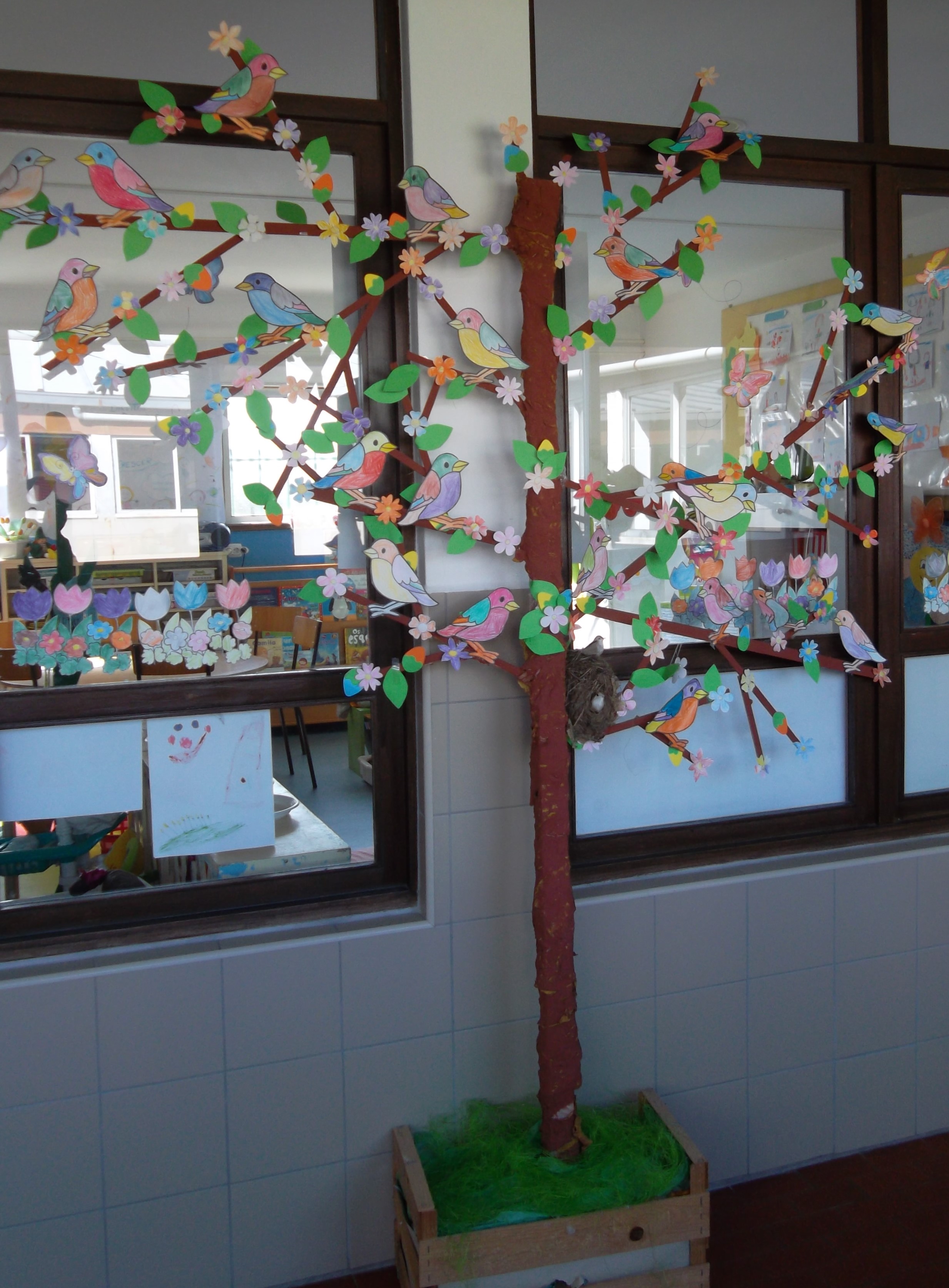 Com a chegada da Primavera chegou também um duende novo à sala o “Botãozinho”. As crianças resolveram chamá-lo assim porque na Primavera as flores estão todas em botão antes de abrirem. Resolvemos então decorar a nossa árvore com elementos caraterísticos da estação e colocámos o ninho da carriça que nos foi trazido pela Patrícia.