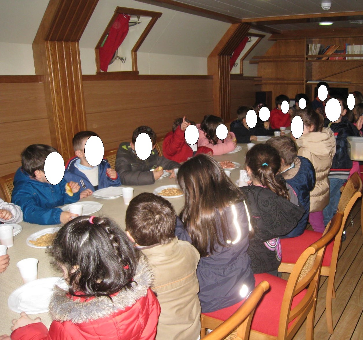 No final da visita a mãe do Pedro ofereceu um lanche muito bom após o qual viemos para o autocarro e descemos as escadas do barco com a ajuda da tripulação porque a chuva teimou em aparecer. Foi uma experiência inesquecível tanto para as crianças como para os adultos