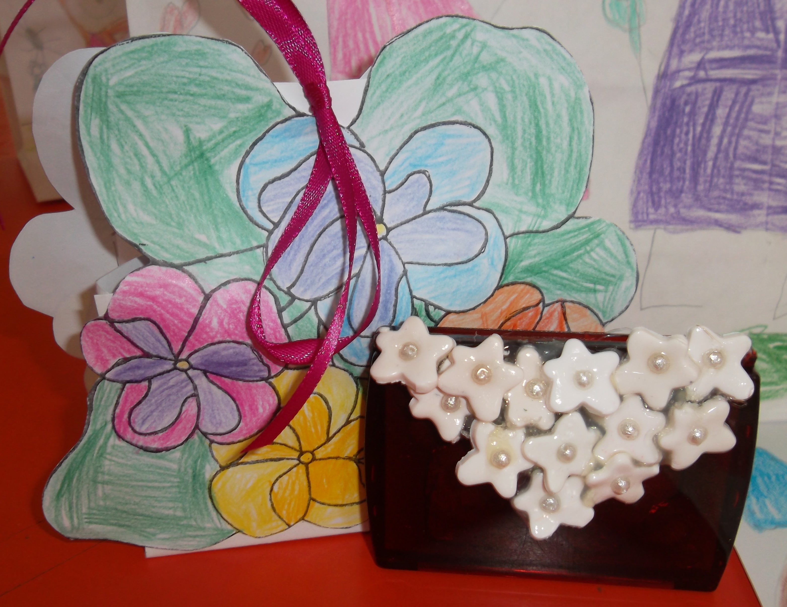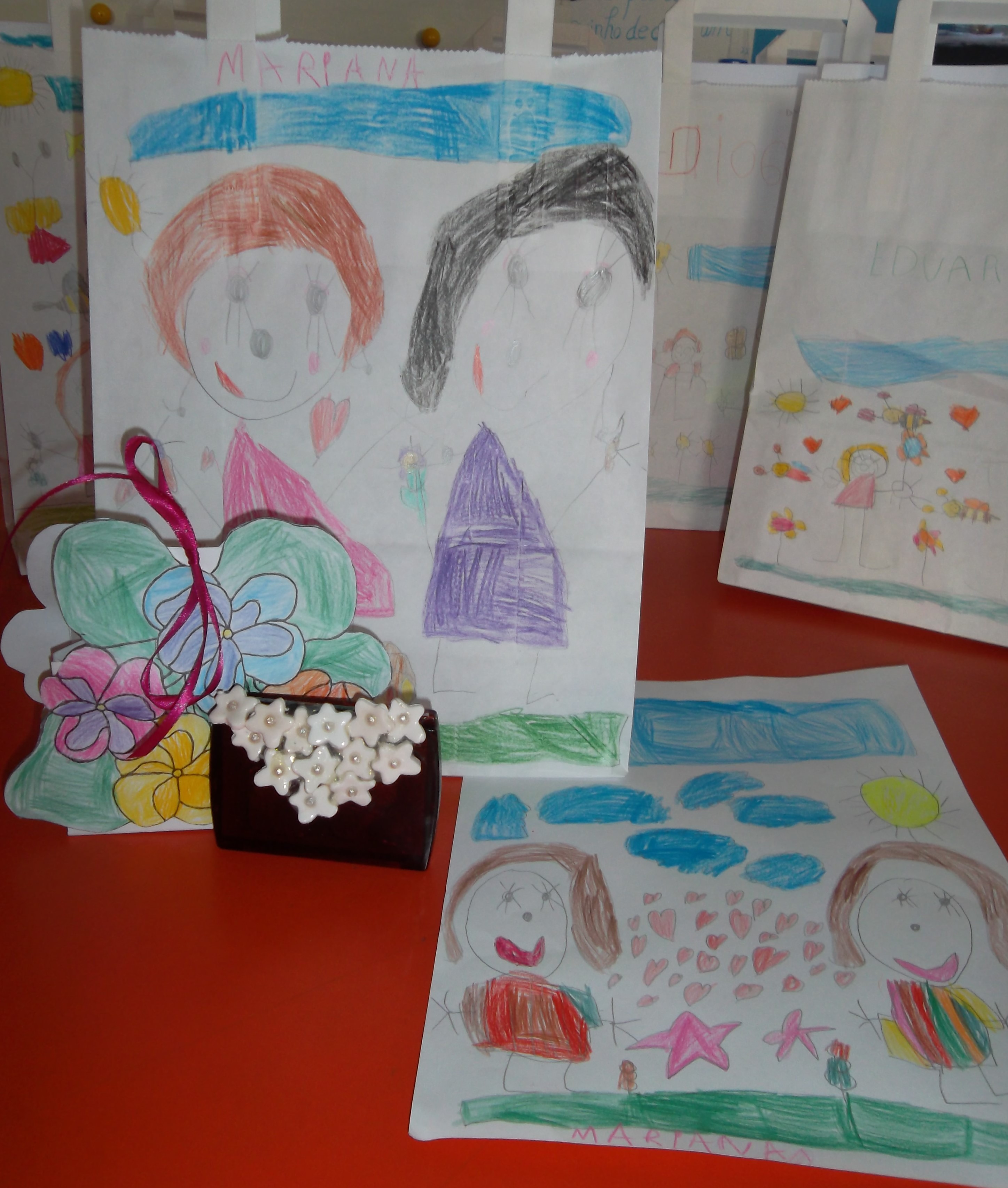 Este ano resolvemos oferecer um espelho às nossas mães de prenda do dia da mãe e com massa fimo e pérolas decorámos a tampa. Como já pintamos muito bem decorámos amores- perfeitos e construímos uma caixa muito própria com muito amor. Desenhámo-nos com a nossa mãe para a decoração dos sacos e fizemos um desenho.
