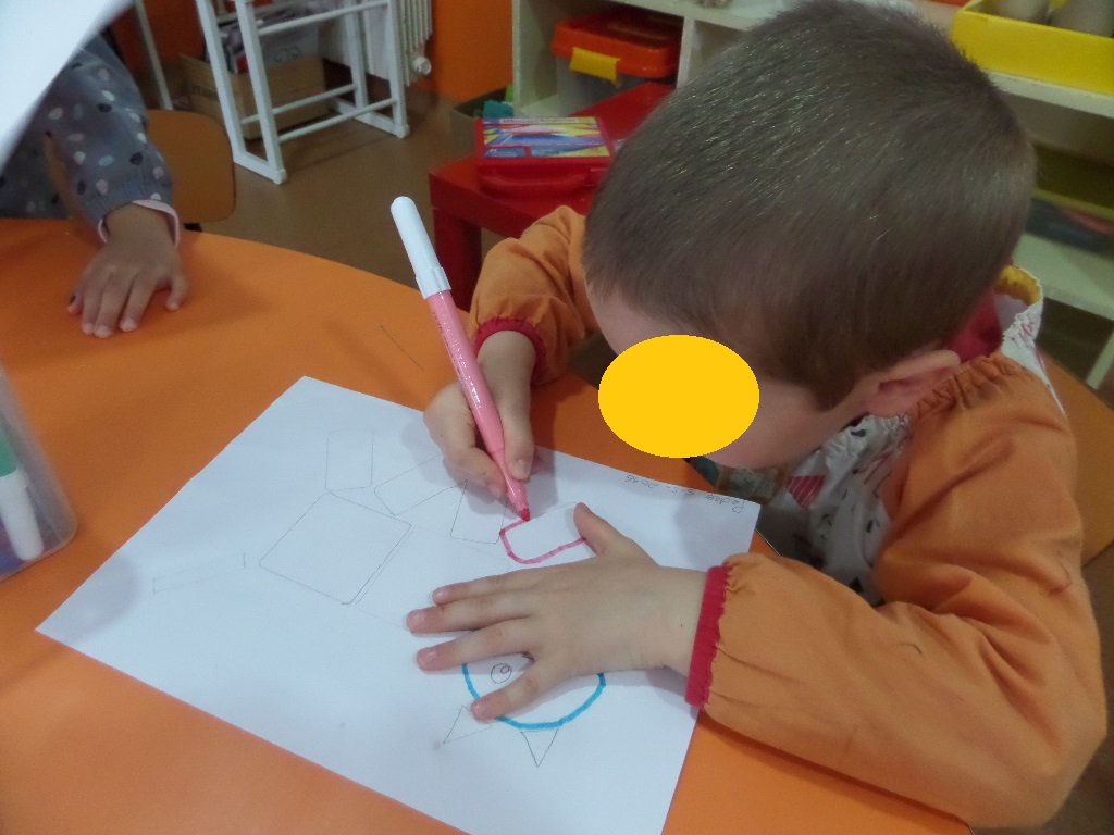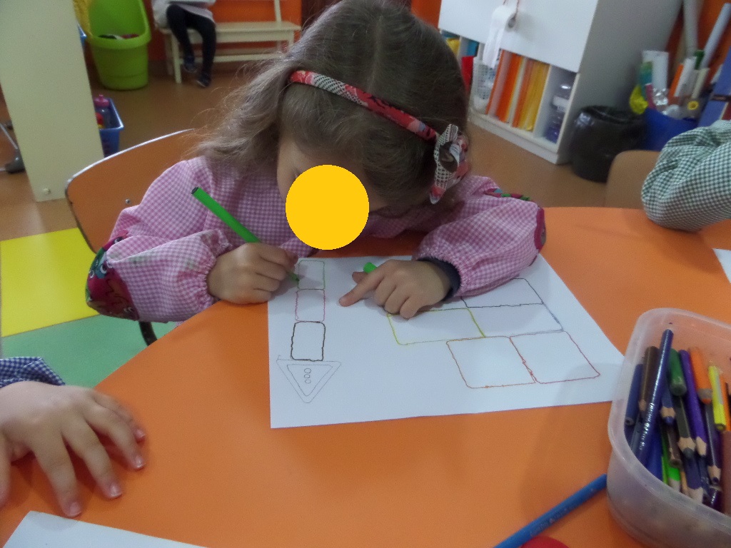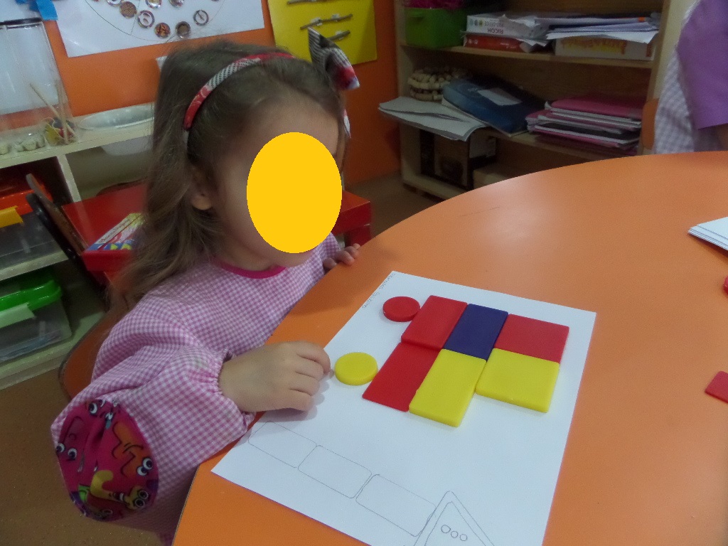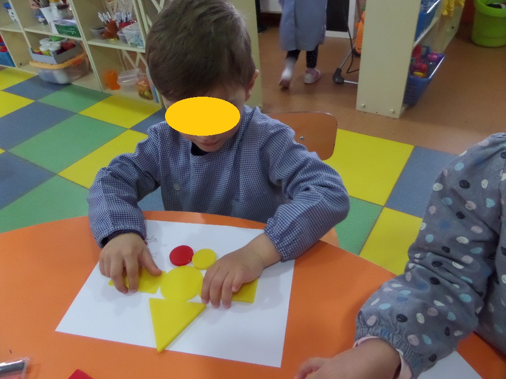 Aprendemos a canção das formas geométricas o triângulo, o círculo, o quadrado e o rectângulo. e fizemos uma montagem com várias figuras, de lá saíram carros, casas, meninos e meninas, gatos, etc…
