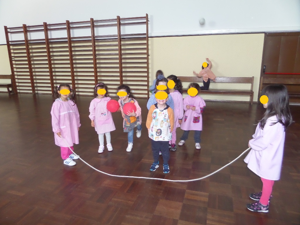 Como sempre à quarta- feira é dia de motricidade global no salão, corremos pulamos e desta vez experimentámos saltar à corda.