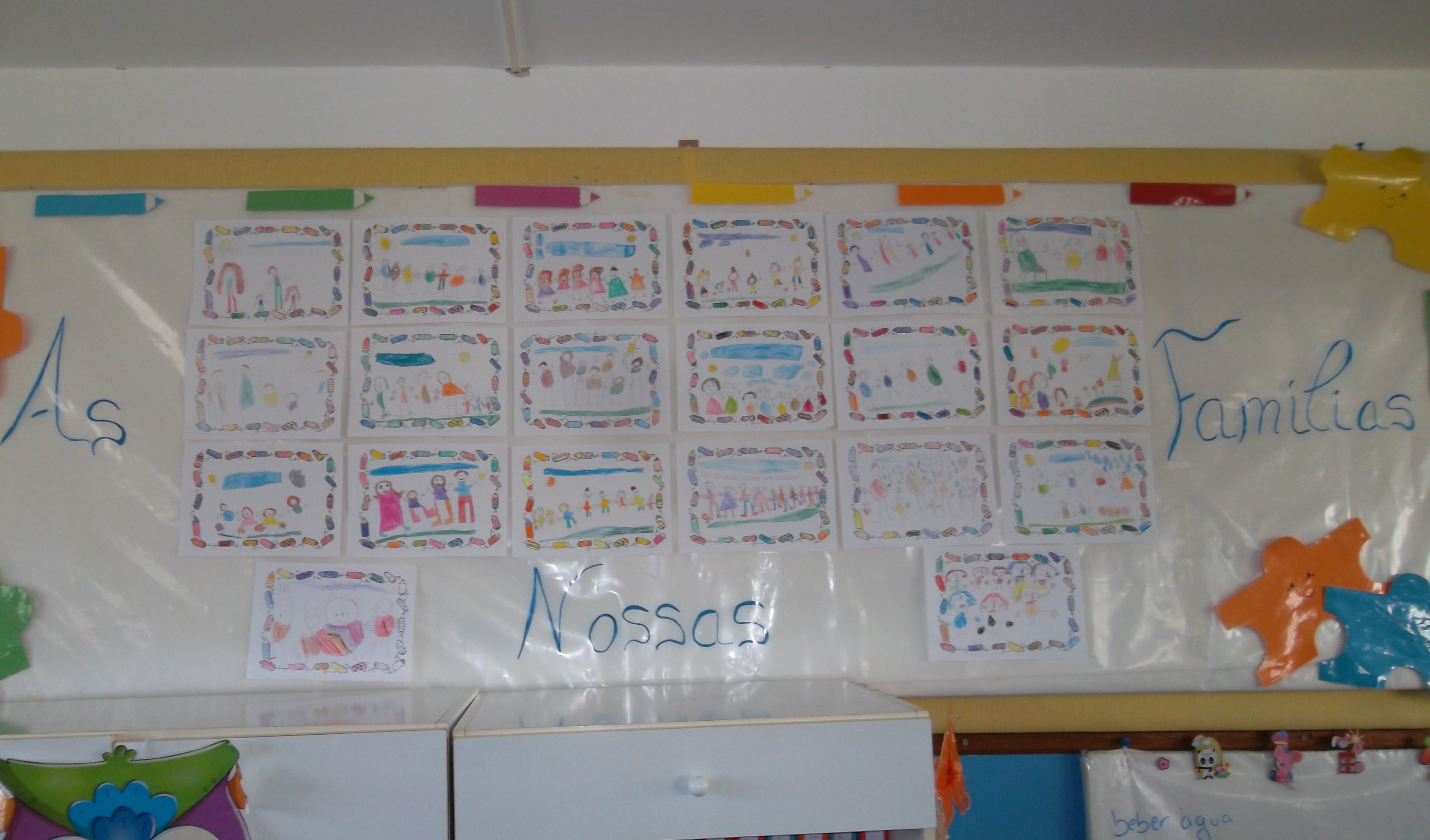No dia da família conversámos sobre a nossa família e cada criança desenhou a sua e com todos os desenhos decorámos o nosso placar das famílias, que ficou muito colorido.