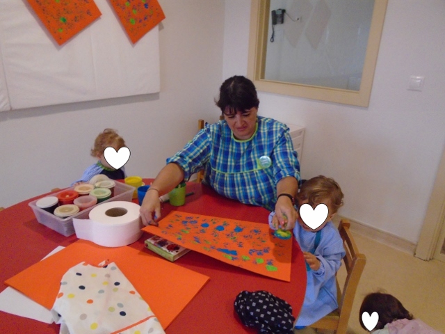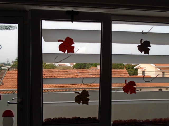 Começamos a falar da estação do Outono, explorando folhas e outras coisas relacionadas com esta estação. Fizemos colagem de papel seda em folhas do Outono. Colámos nos vidros, onde pusemos também cogumelos que fizemos com a impressão dos dedos. Fizemos ainda uma árvore do outono com a impressão das nossas mãos com as cores desta estação. Ficou mesmo com um tom de outono. Até gostamos de fazer estes trabalhinhos. Mas também exploramos a nossa sala agora com mais confiança e segurança, somos curiosos e queremos experimentar tudo.