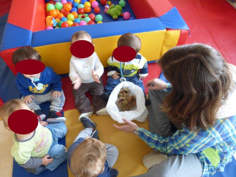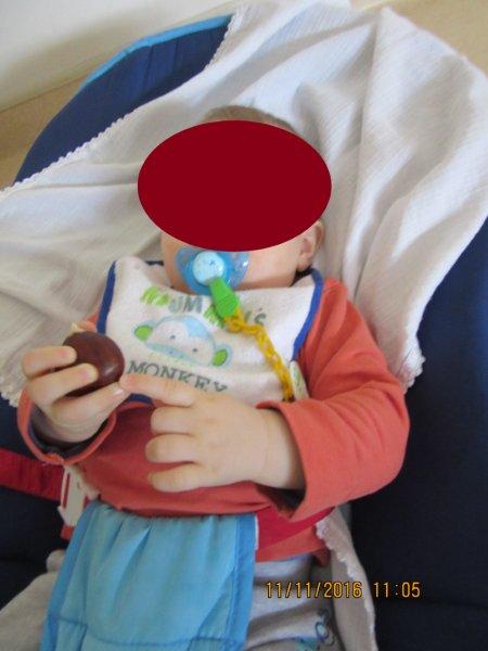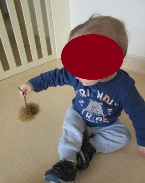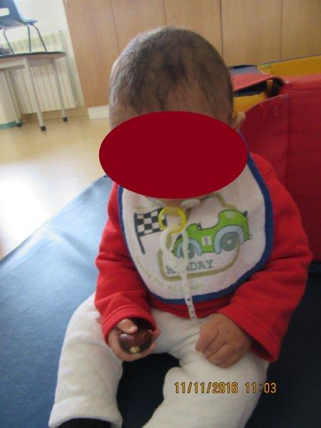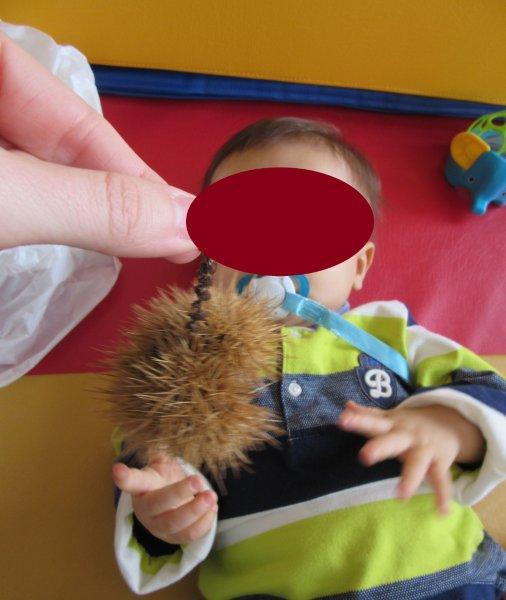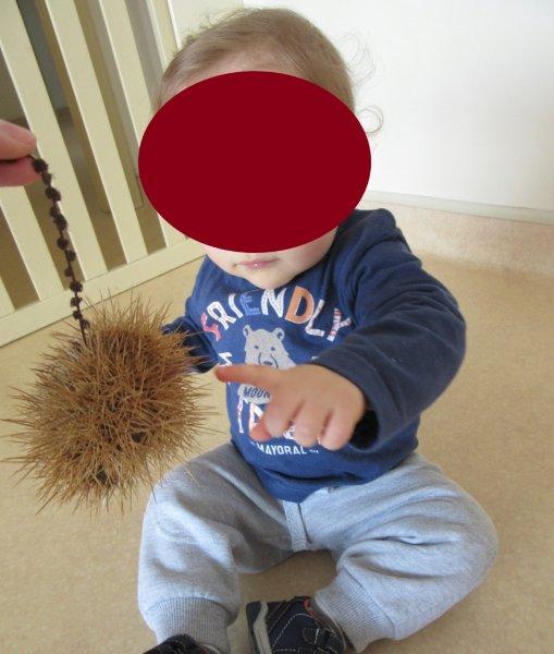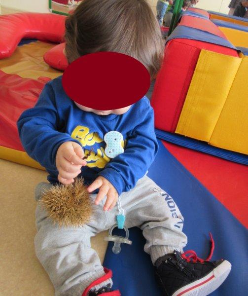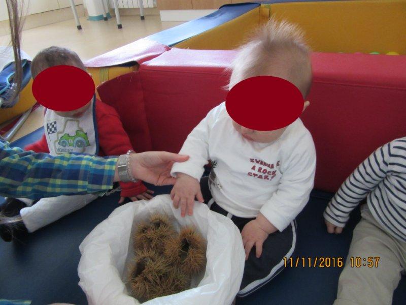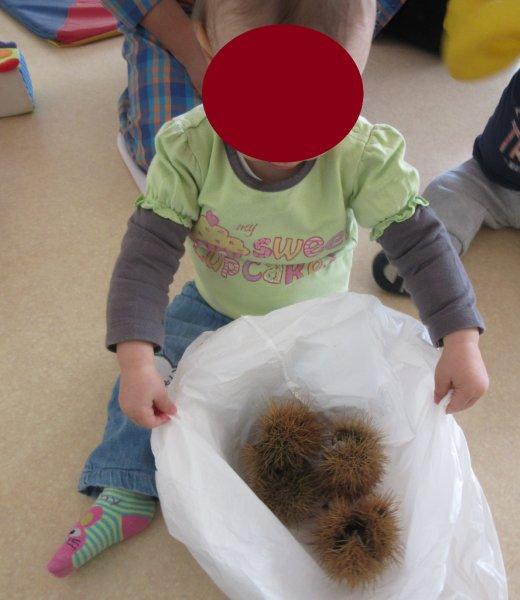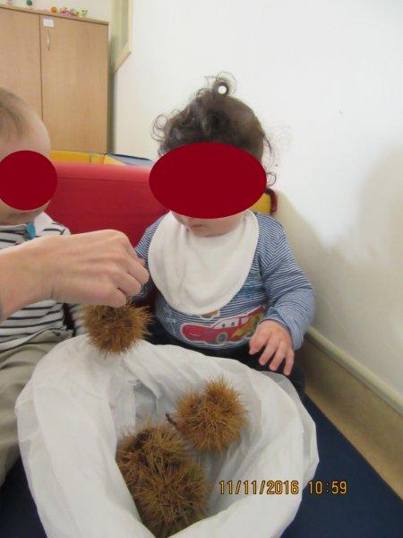 Ao som de músicas do magusto, descobrimos as castanhas e os seus ouriços e descobrimos que eles picam e que temos de mexer neles com muito cuidado para não nos magoarmos. No entanto, foi muito divertido podermos explorá-los, sempre com os adultos da nossa sala por perto para que não fizéssemos movimentos bruscos que nos picassem a valer… Houve alguns de nós que descobriram uma maneira de lhes pegar sem picar as mãos, outros pegavam só no saco para não terem de lhes tocar, outros ainda deixavam que guiássemos as suas mãos para que lhes tocassem, mas sempre com olhar desconfiado… Foi muito giro!