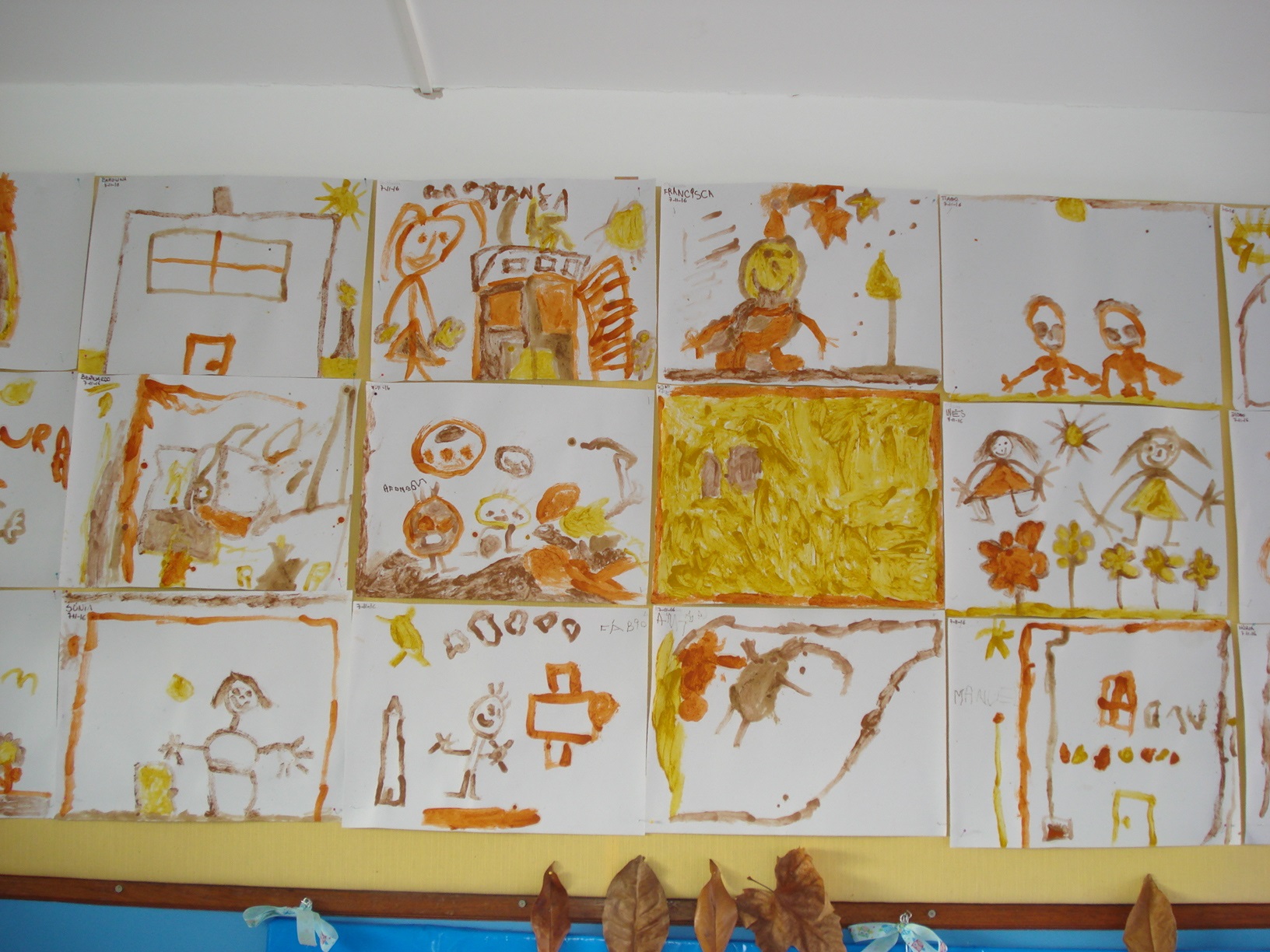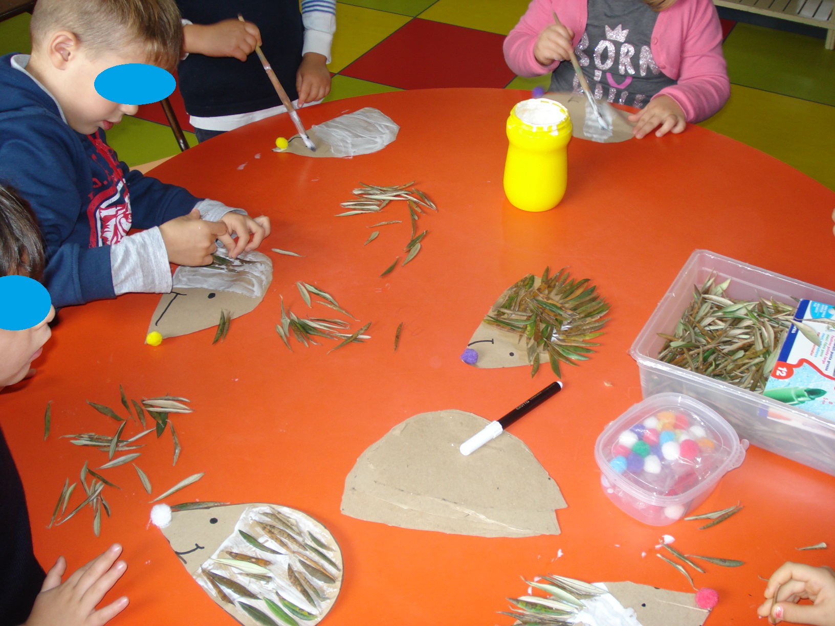 Vamos contar-vos as novidades deste mês de novembro, falamos de castanhas, castanheiros e ouriços e também do S. Martinho. Com terracota fizemos uma castanha que depois animamos com olhos, nariz, boca, cabelos, braços e pernas, colamo-la num crachá, esta era para usarmos no dia de S. Martinho, fomos ao exterior apanhar folhas de oliveira para fazermos os espinhos de um ouriço-cacheiro, primeiro recortamos o ouriço, depois desenhamos os olhos, nariz e boca e colamos-lhe os “espinhos”.