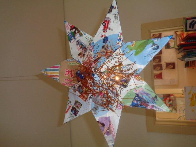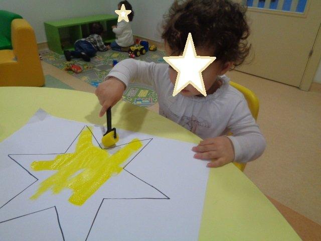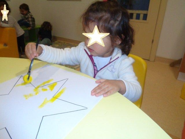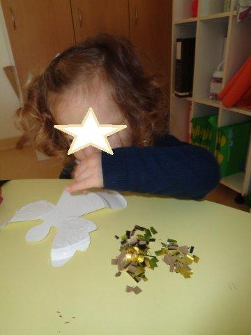 Fizemos uma árvore de natal com cartão e usámos uma técnica nova com balão, cola e lã. Estrelas, anjos e nuvens decoraram os nossos vidros e fizemos algumas colagens com materiais brilhantes alusivos a esta época.