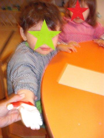 Para levar a nossa fotografia junto à árvore de Natal, imprimimos a nossa mão num postal para oferecer também aos pais.