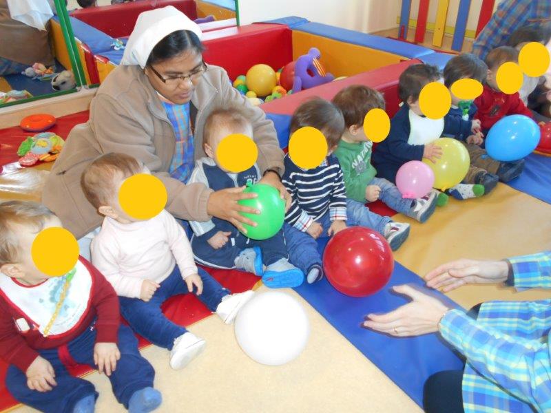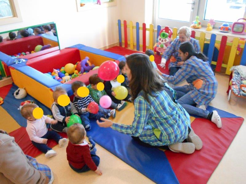 Ao som da música “O balão do João”, explorámos balões coloridos uns estavam cheios só com ar, mas havia outros que também tinham arroz lá dentro e, quando os abanávamos, faziam barulho, então, pudemos trabalhar ritmos e sons com eles…