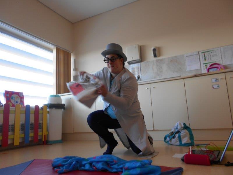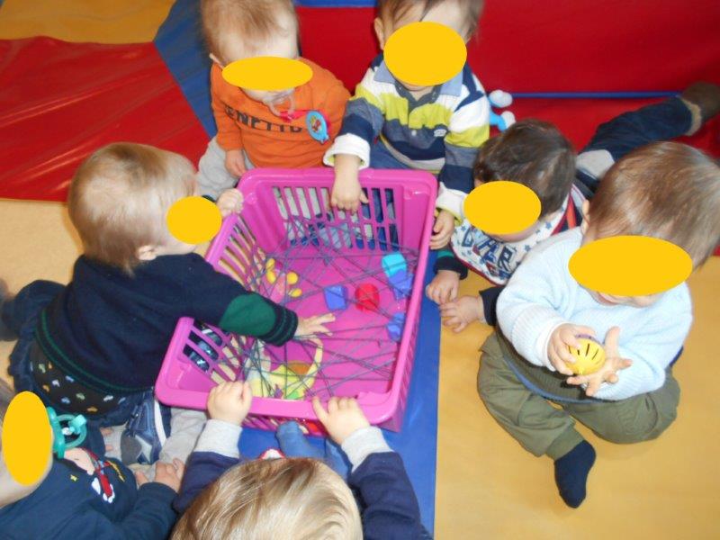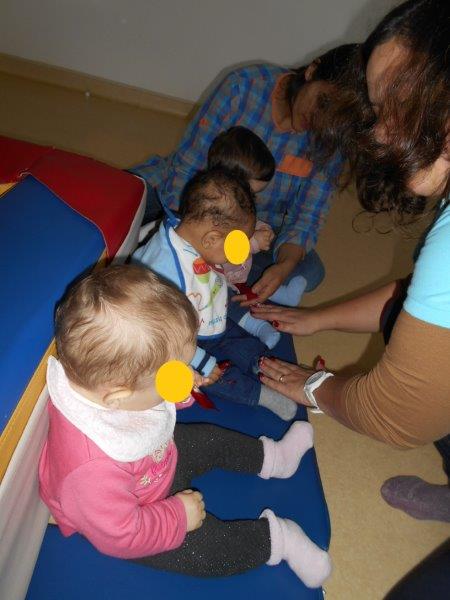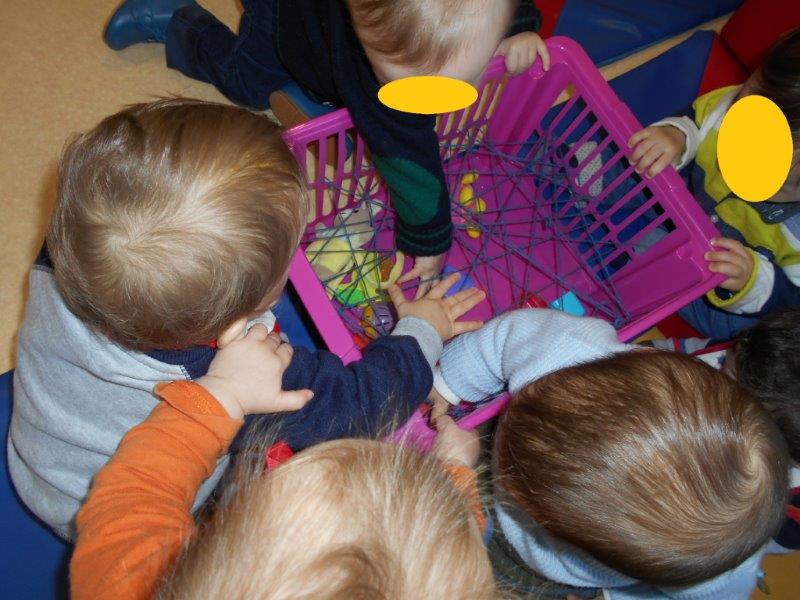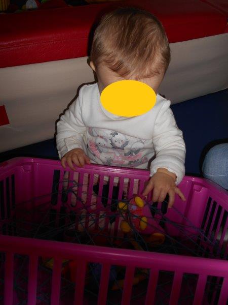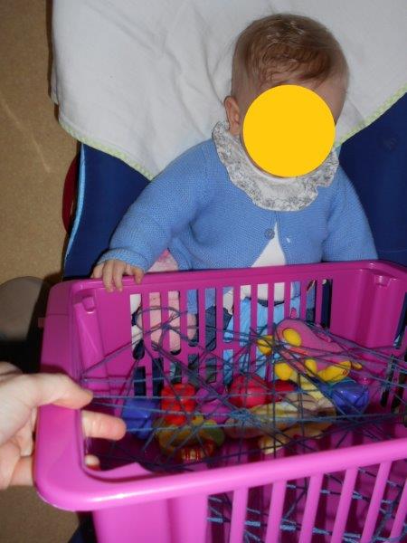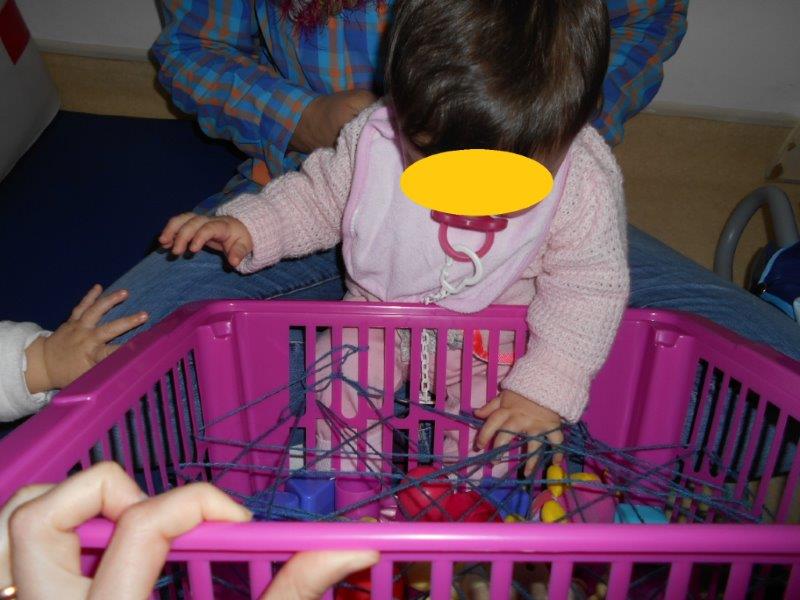 Depois, foi a vez do desafio de motricidade fina, a Cláudia apareceu com um cesto com brinquedos no fundo, mas para os tirarmos tínhamos de passar por um entrançado de lã que nos dificultava bastante a tarefa, pois os brinquedos ficavam presos no meio dos fios! Foi muito giro e, depois de algumas tentativas, lá conseguimos superar o desafio.