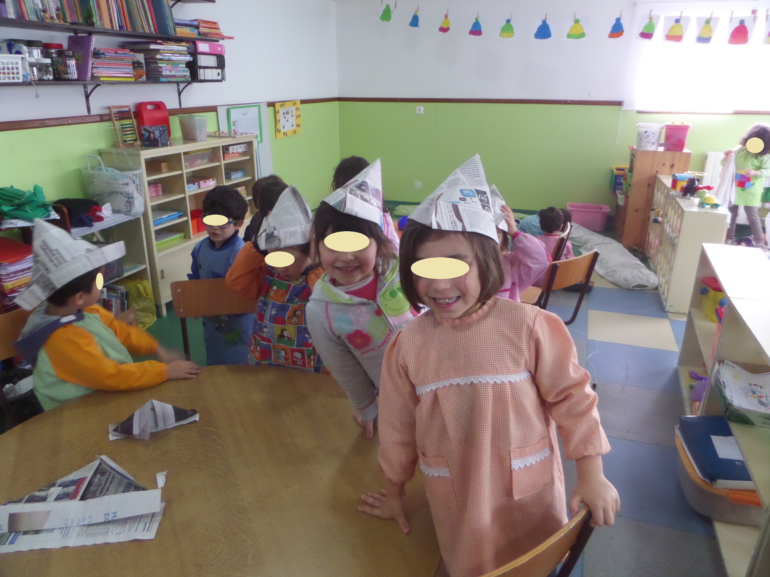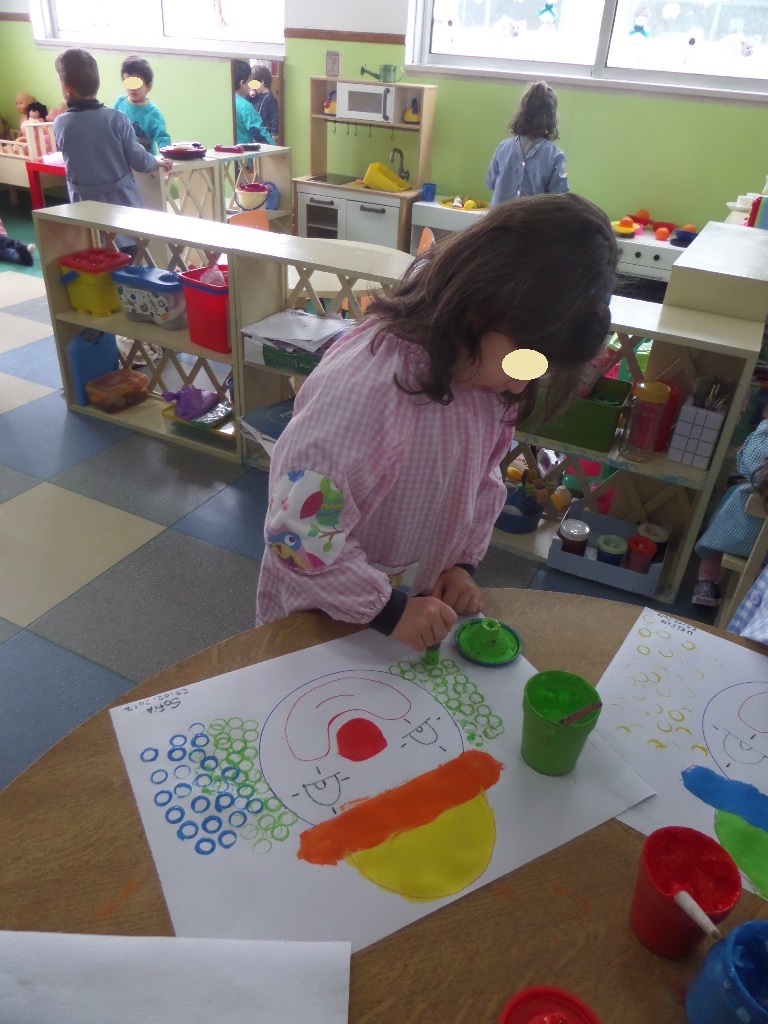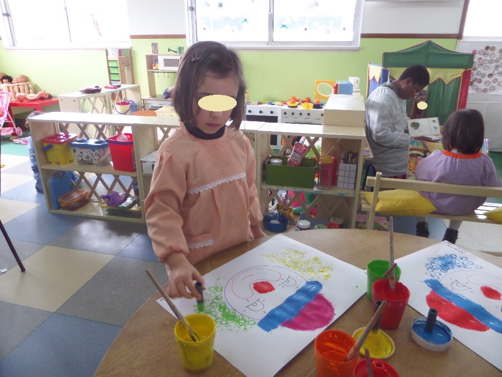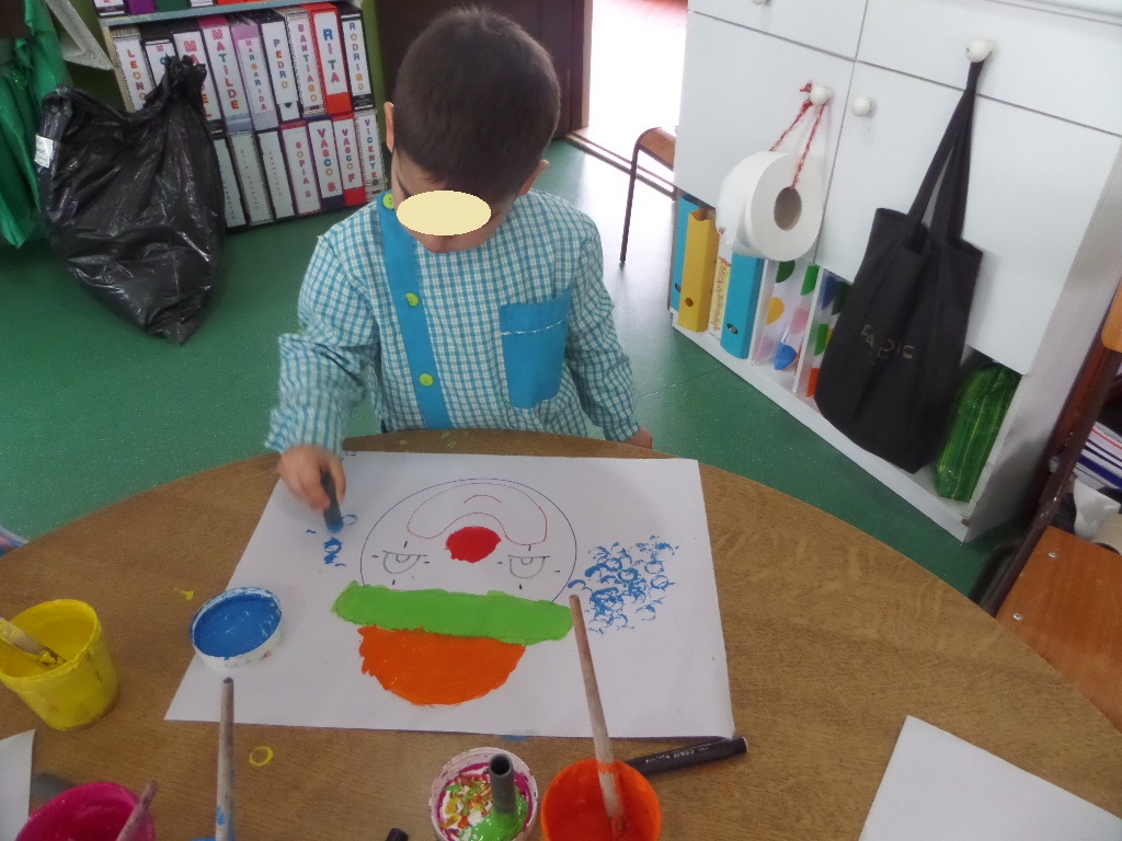 Na sala houve também oportunidade de explorarmos algumas técnicas de pintura (com cotonetes e com carimbos), para decorarmos a nossa sala para o Carnaval com uns palhacinhos e uns piratas coloridos.