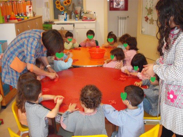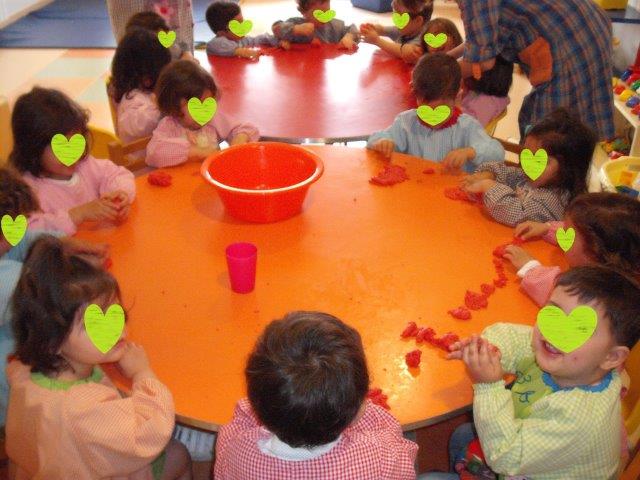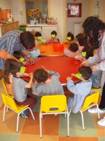 Também brincámos com massa de farinha, explorando e dando forma à massa imitando e tentando fazer o que nos era mostrado.