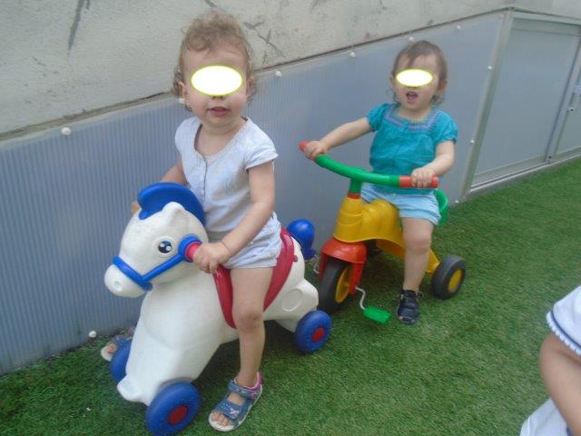 Temos ido também várias vezes até aos espaços exteriores, nós adoramos ou brincamos nas casinhas, ou com bolas ou com os triciclos e os baloiços.