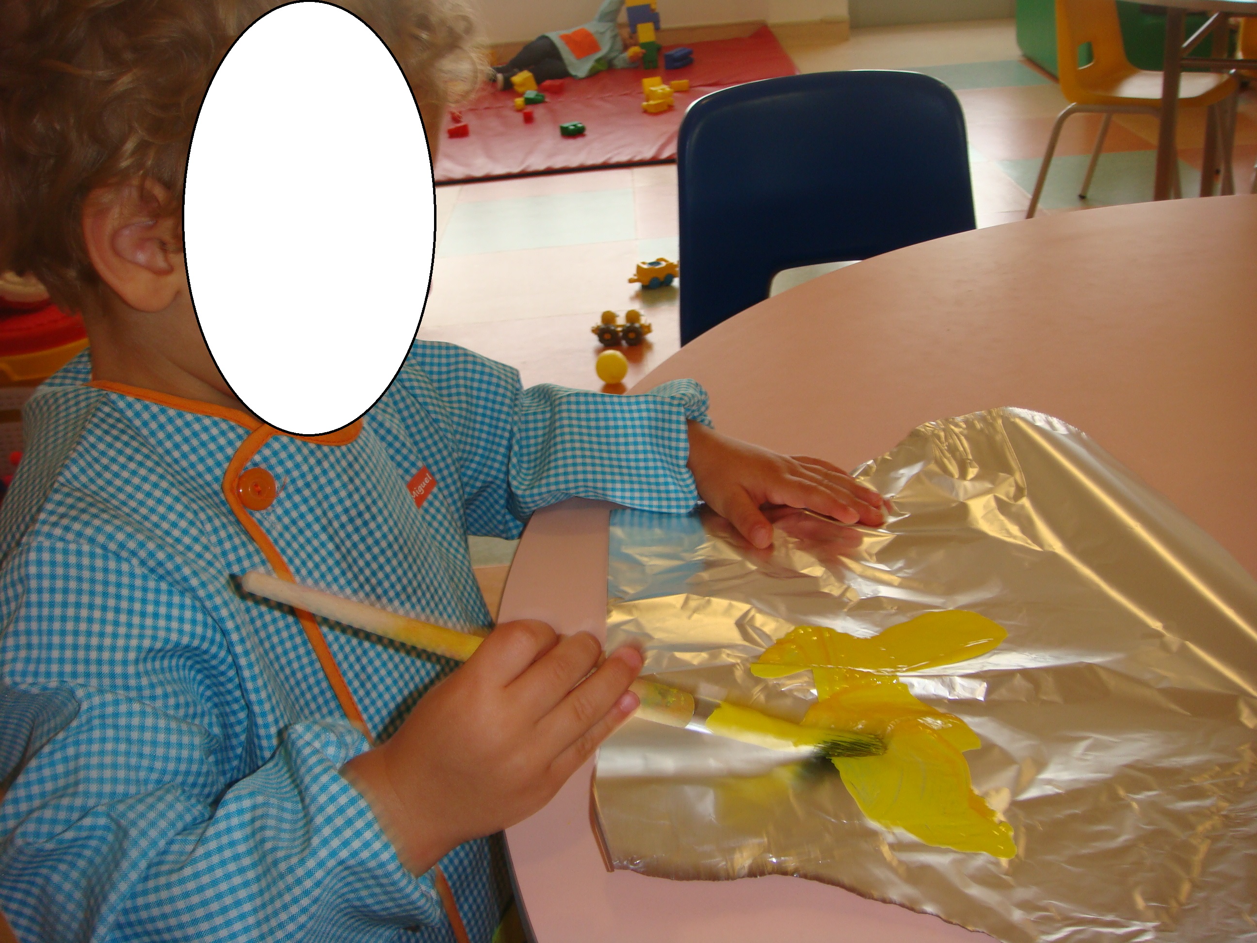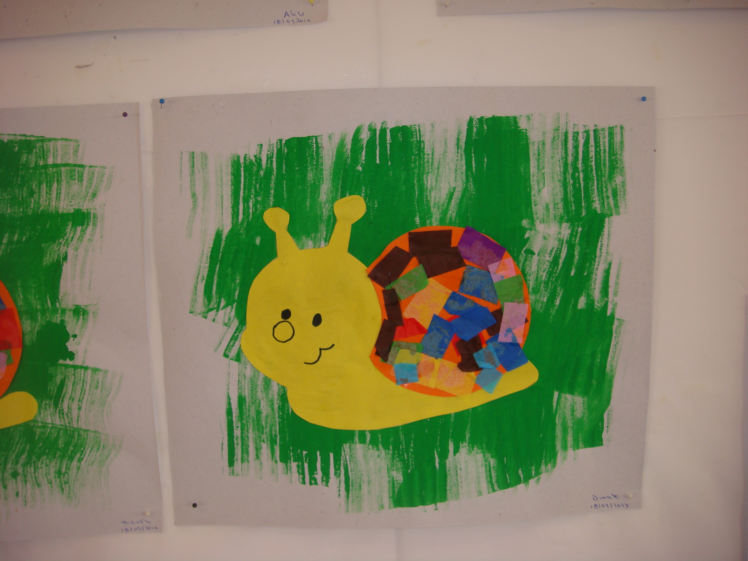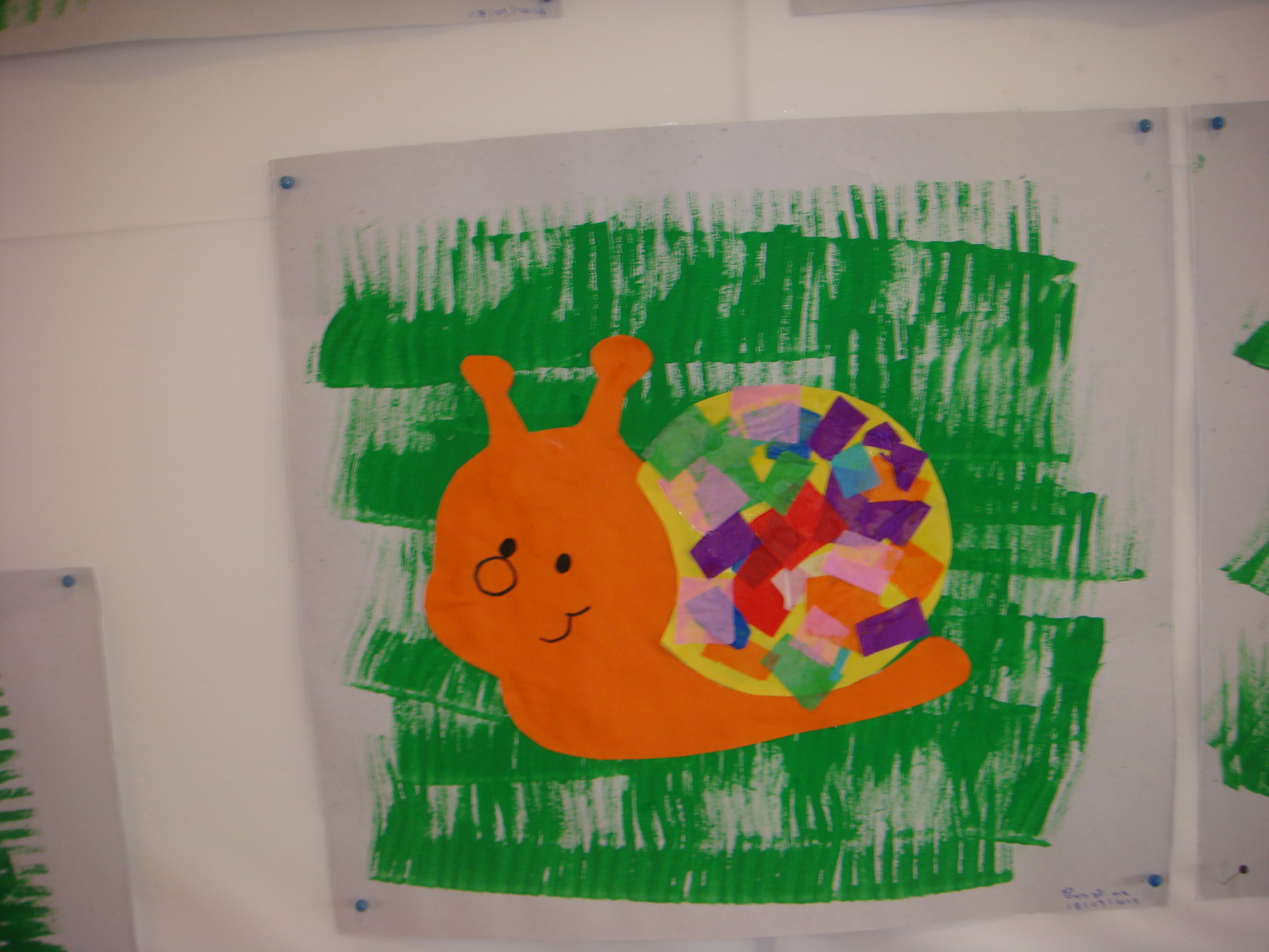Fizemos caracóis onde colámos papel seda colorido de várias cores e pintámos com um rolo. Ficou muito colorido.