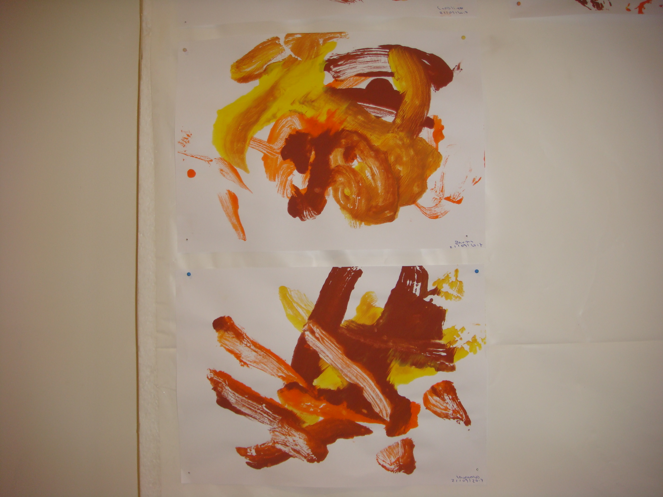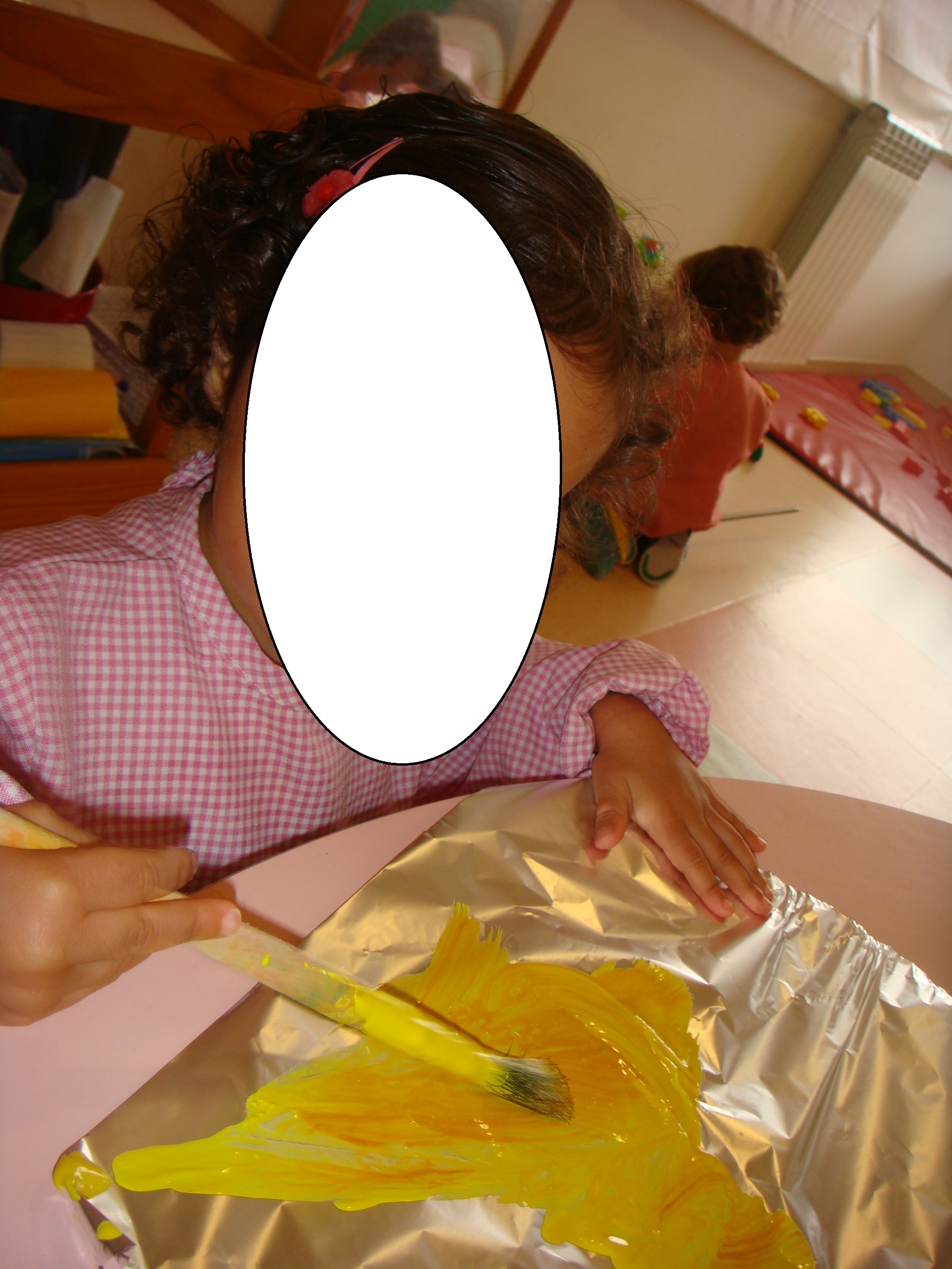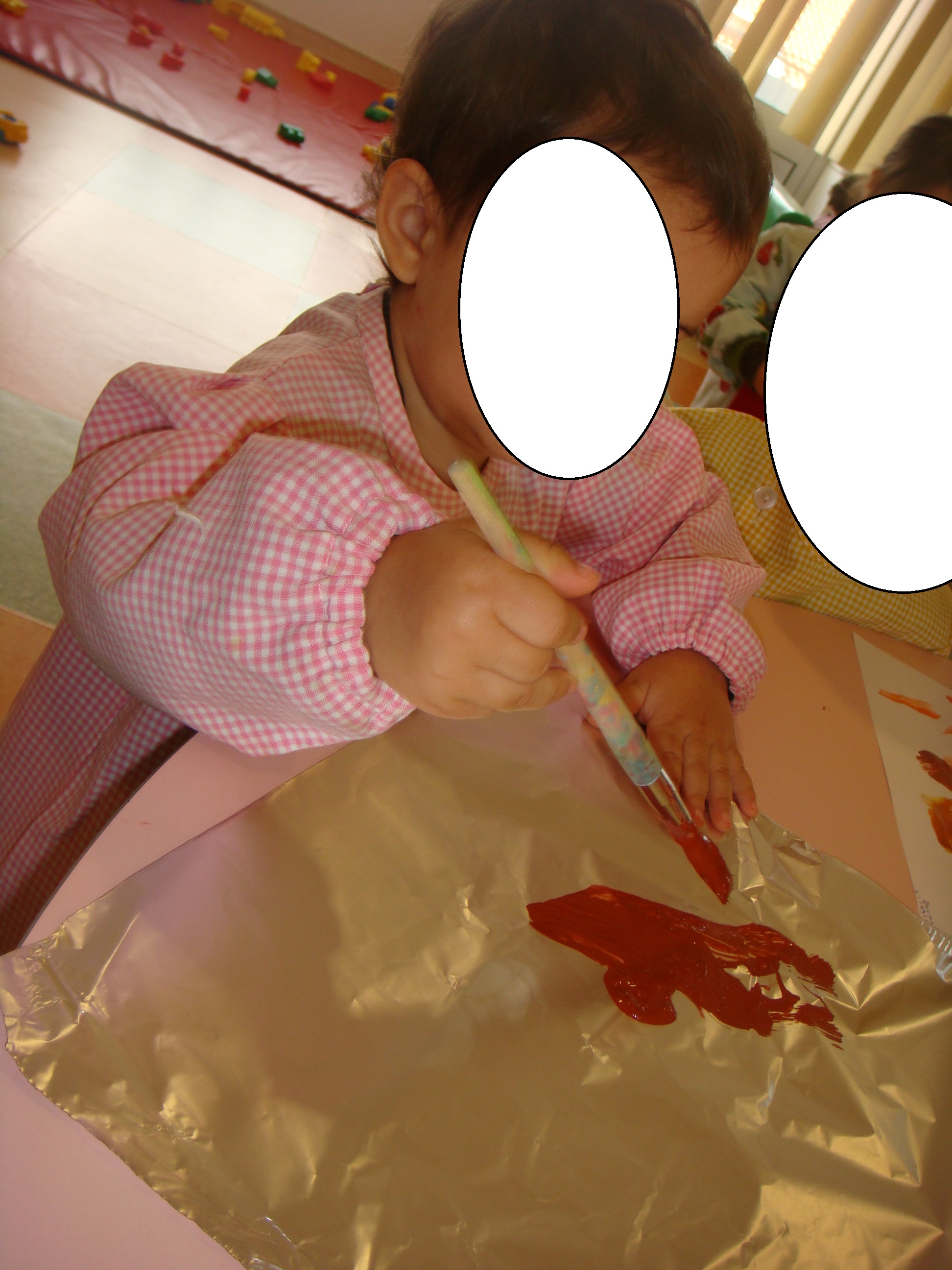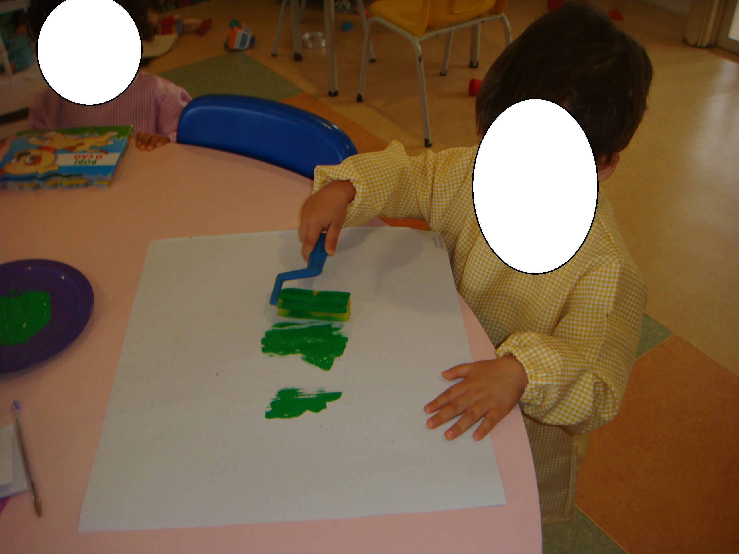 Fizemos caracóis onde colámos papel seda colorido de várias cores e pintámos com um rolo. Ficou muito colorido.