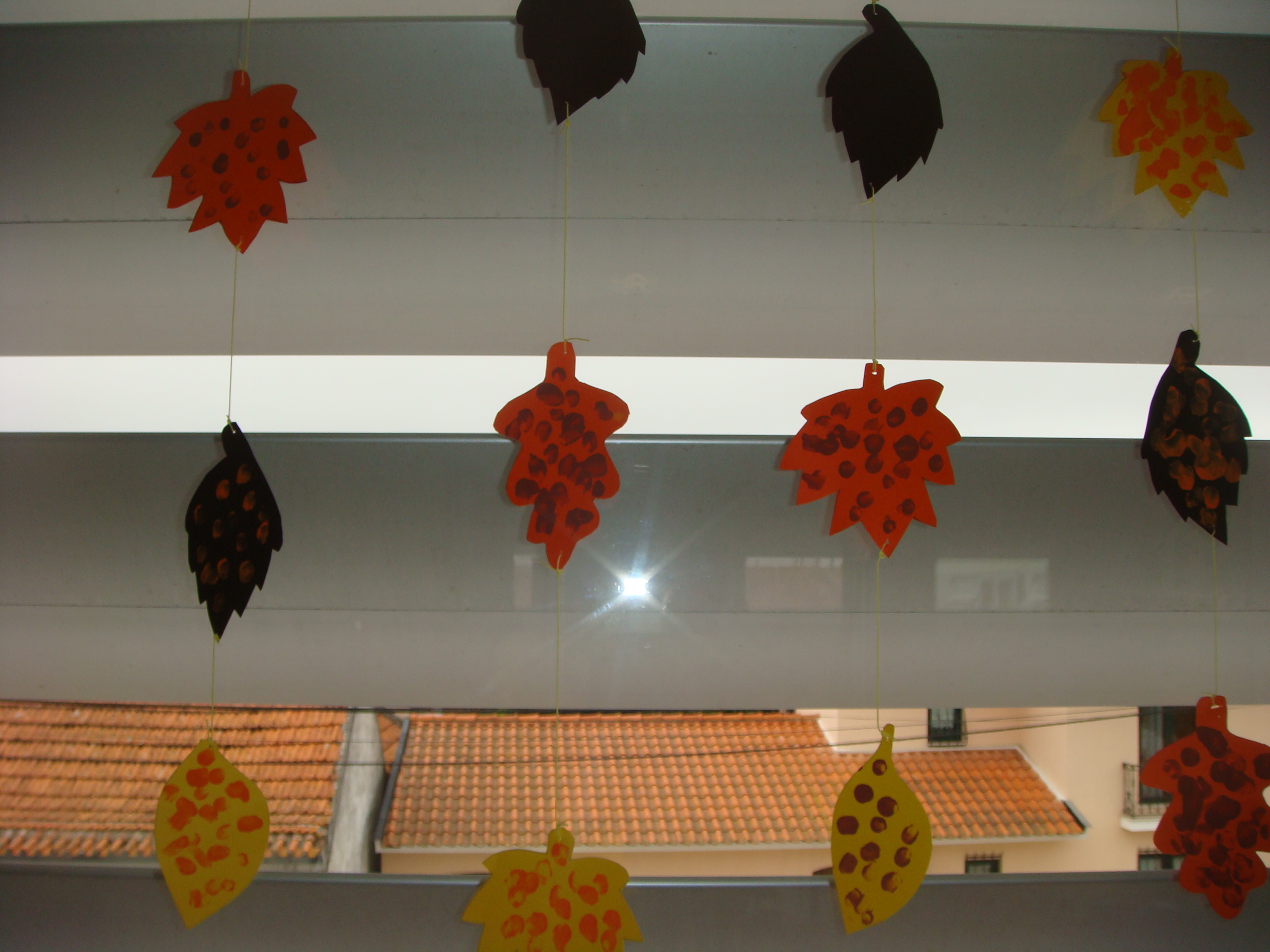Para a janela fizemos folhinhas do Outono com os nossos dedos e também uma pintura com as cores do Outono.