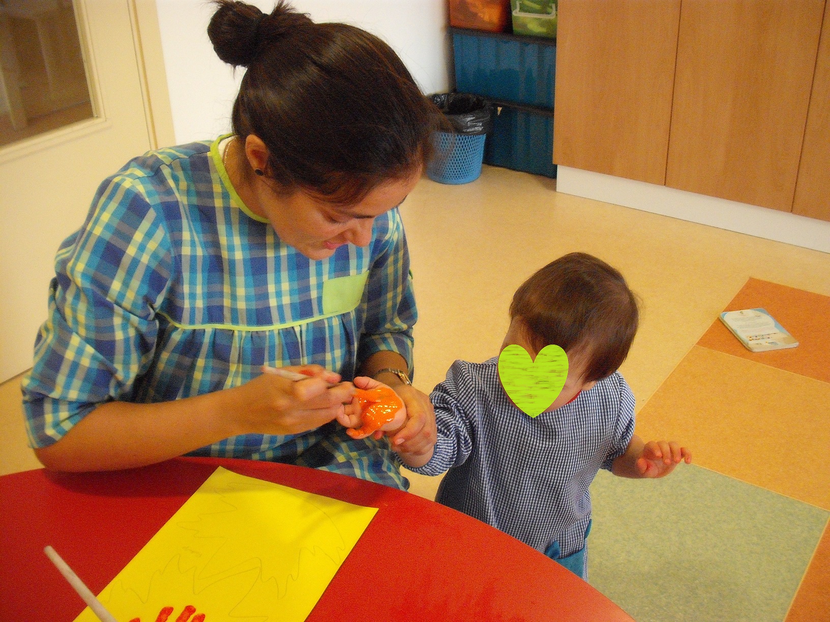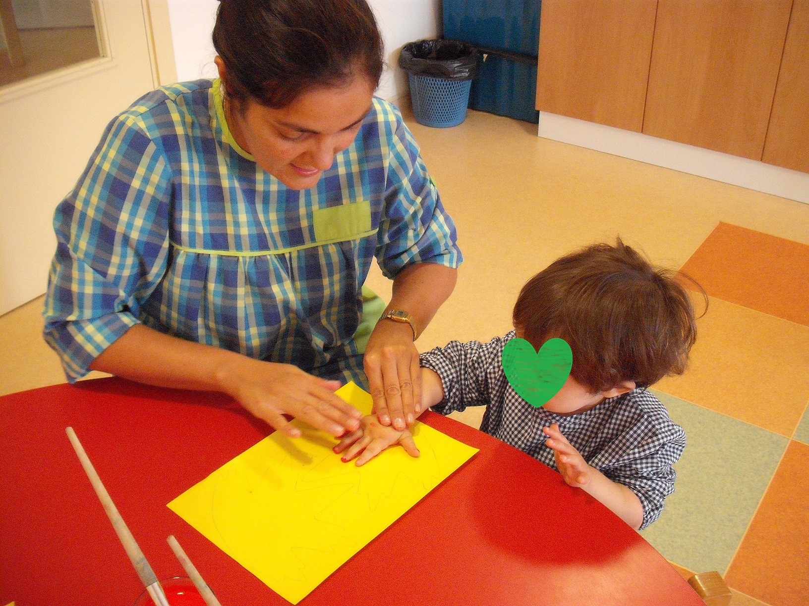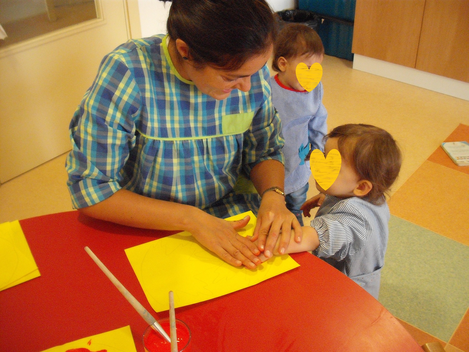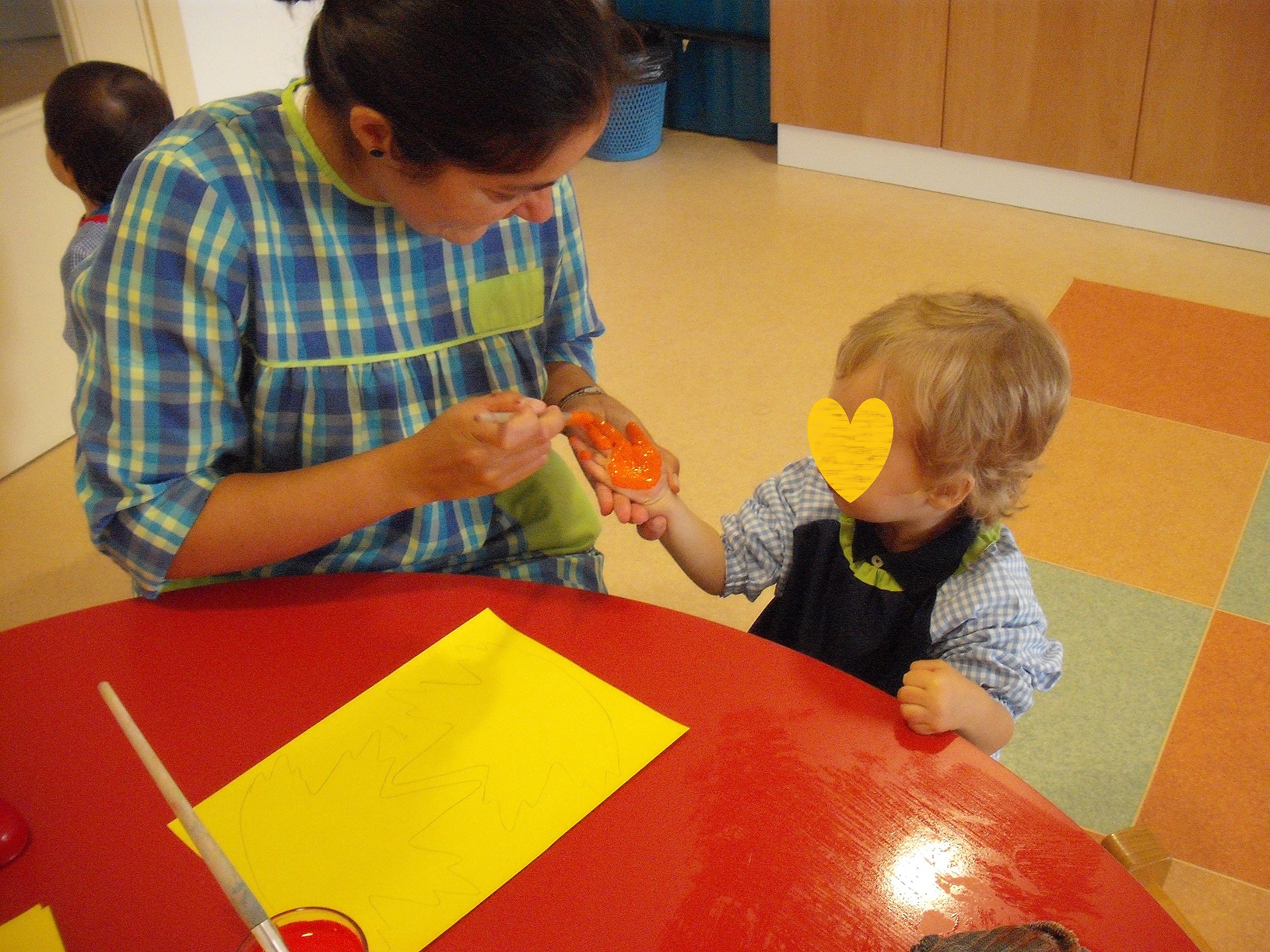 Já fizemos alguns trabalhinhos, mas o primeiro foi a impressão das mãos numa folha de outono para decorar as janelas da nossa sala.