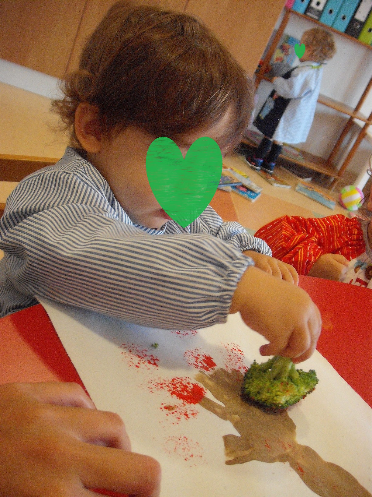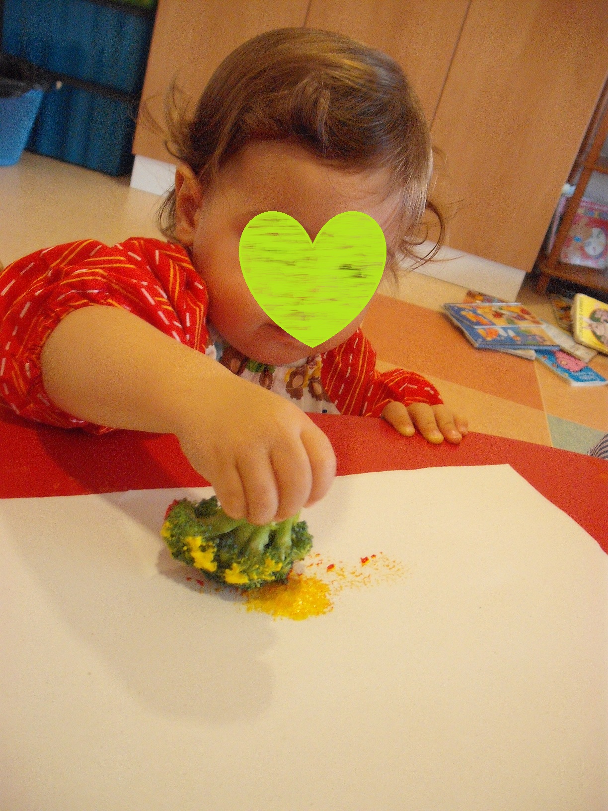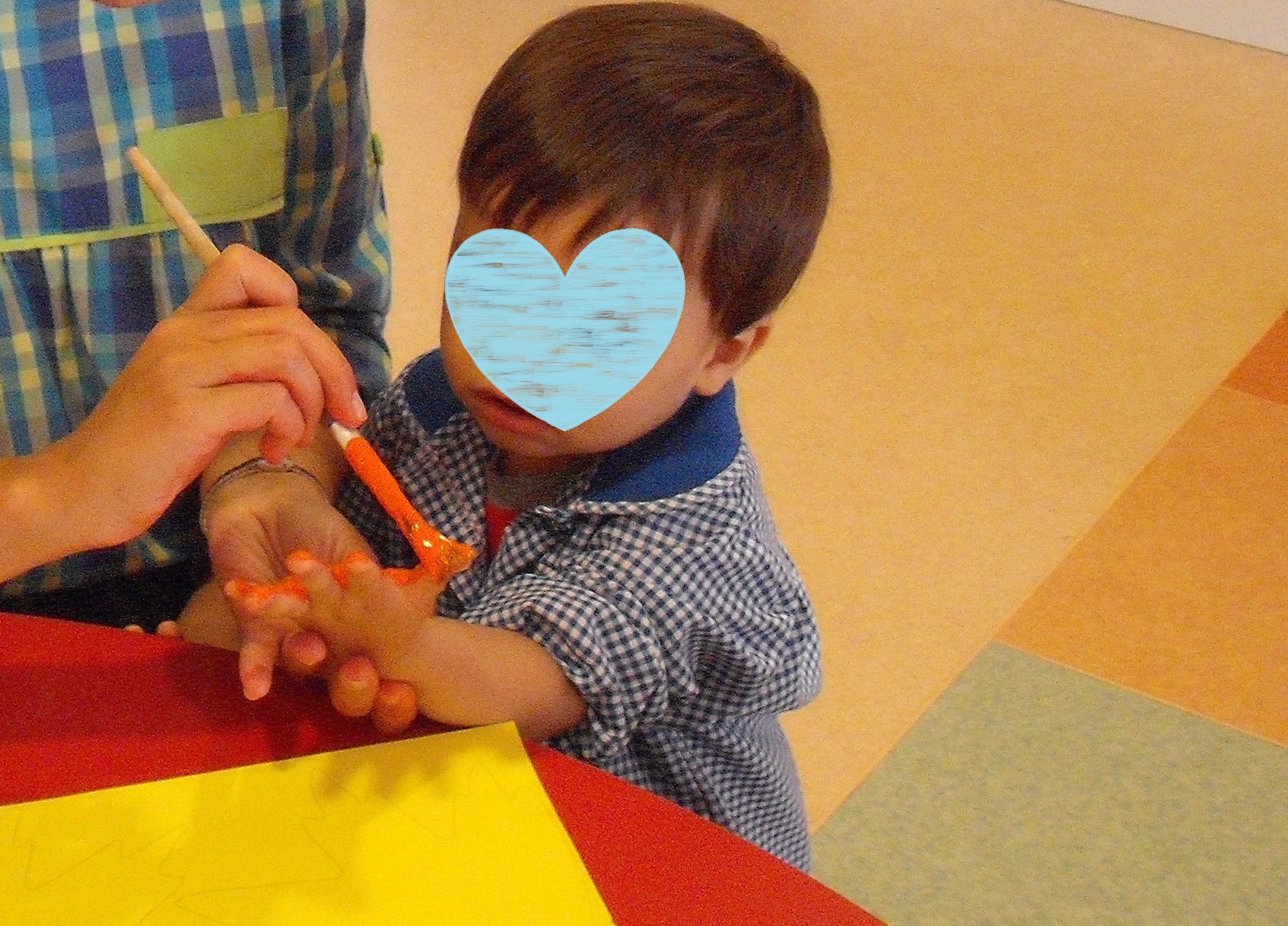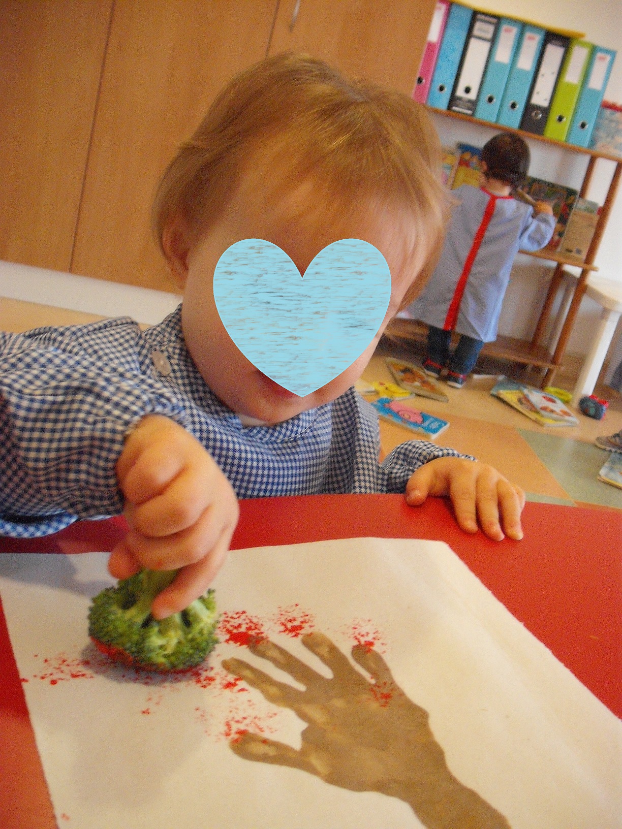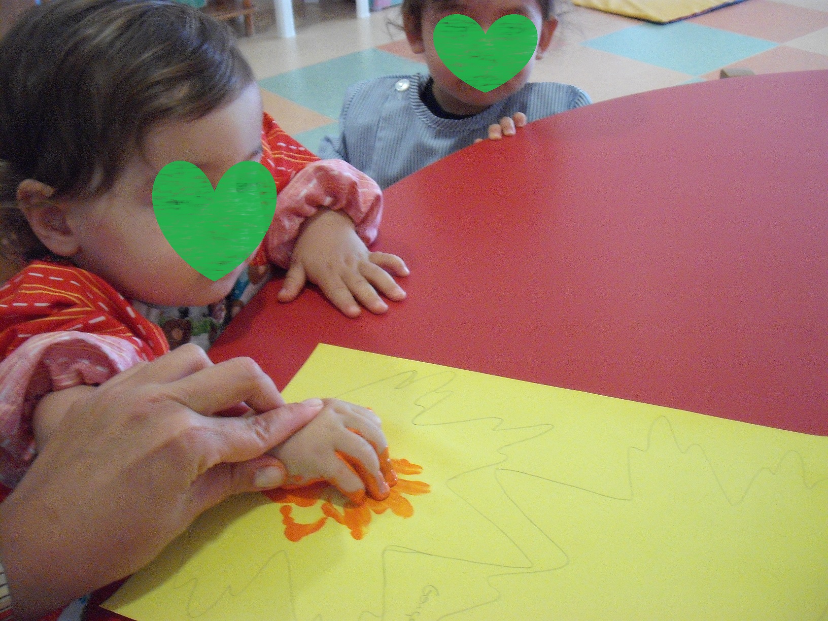 Já fizemos alguns trabalhinhos, mas o primeiro foi a impressão das mãos numa folha de outono para decorar as janelas da nossa sala.