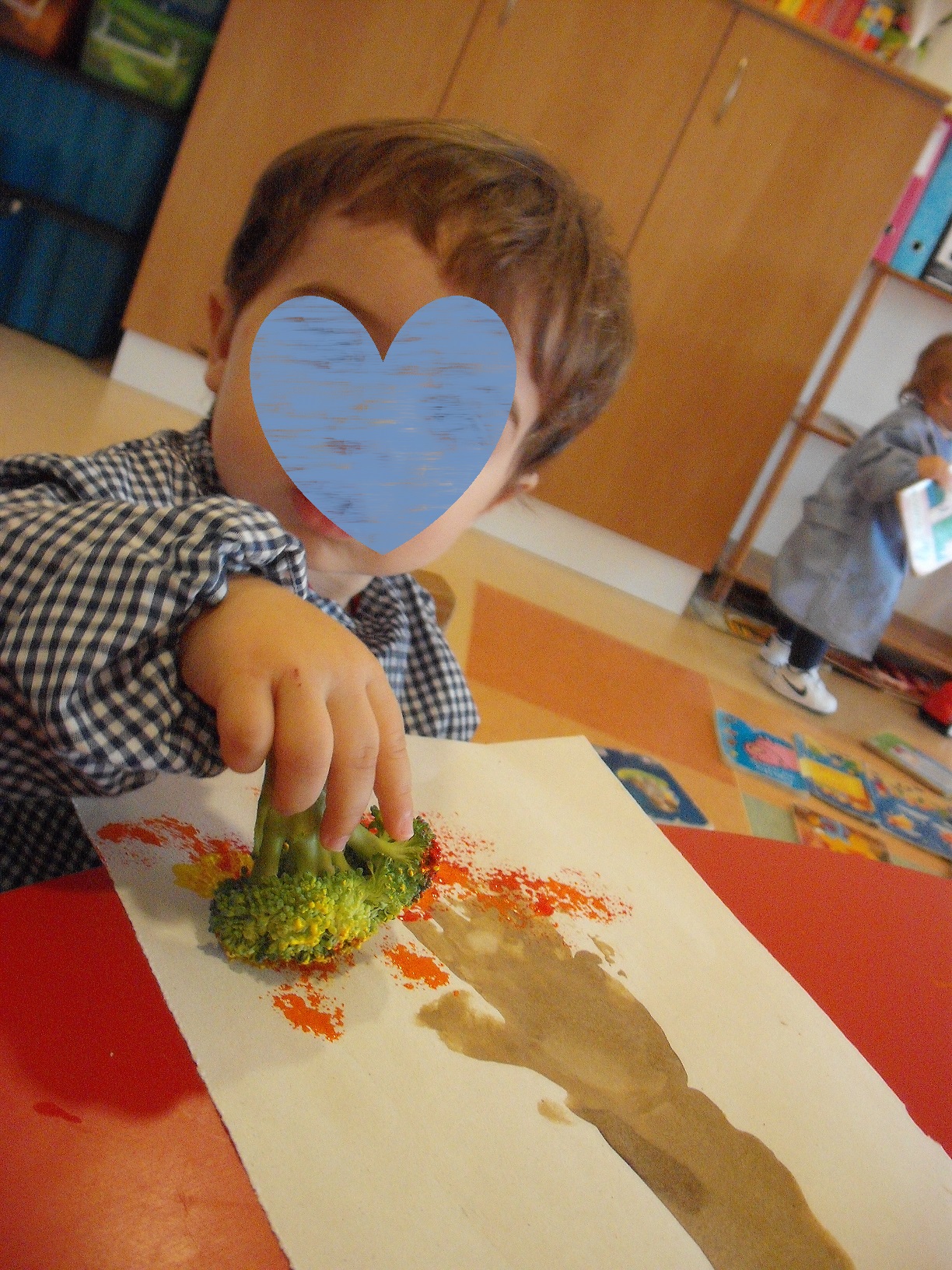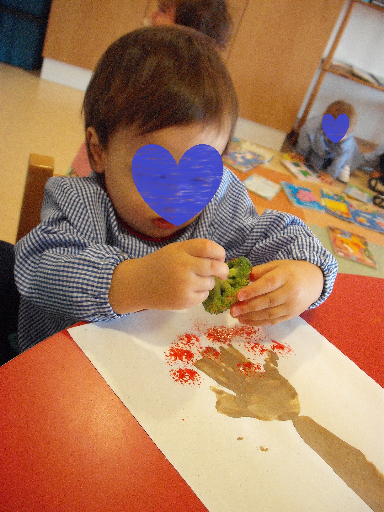 Fizemos a impressão da nossa mão e ante braço com café, a fazer de conta que é uma árvore de outono, e com broculos, carimbamos as folhinhas na árvore.