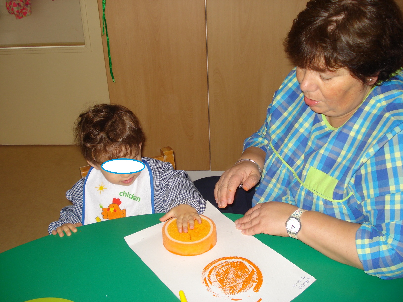 Na sala utilizamos esponjas com a forma de uma laranja para carimbar. Com uma maçã fizemos carimbagem e utilizamos tinta vermelha e verde, utilizamos garfos para ser mais fácil pegar na metade da maçã.