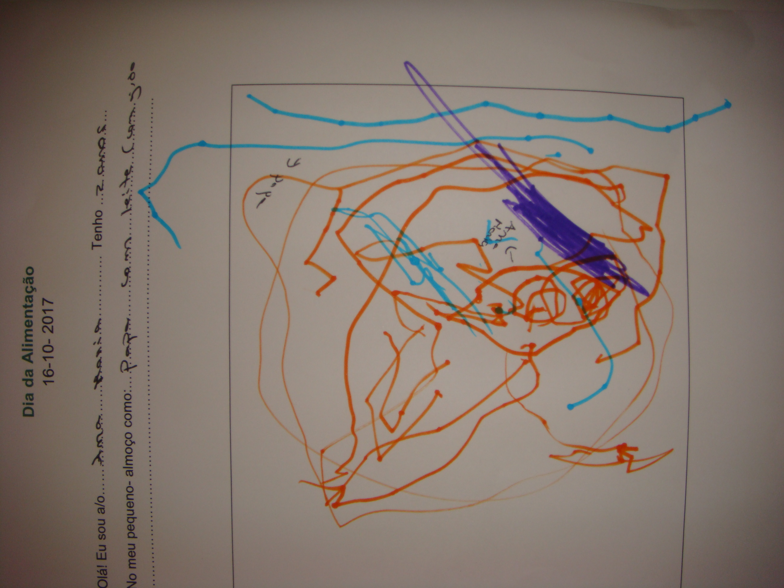 No dia da alimentação, a Sandra mostrou-nos uma história de alimentos que devemos comer em maior quantidade e outros não tanto, explicando o porquê. Depois cada um de nós referiu o que costuma comer ao pequeno- almoço, desenhando depois graficamente. Alguns de nós já se expressa e percebe bem as coisas.