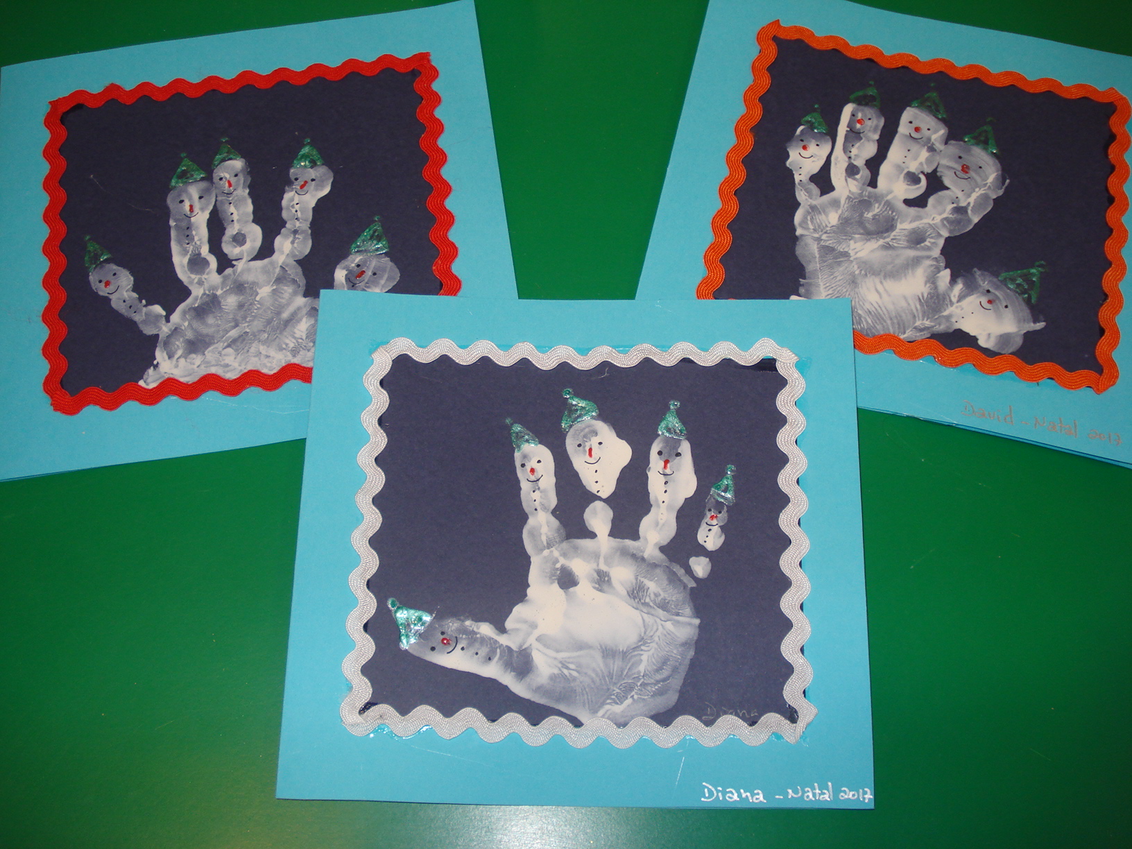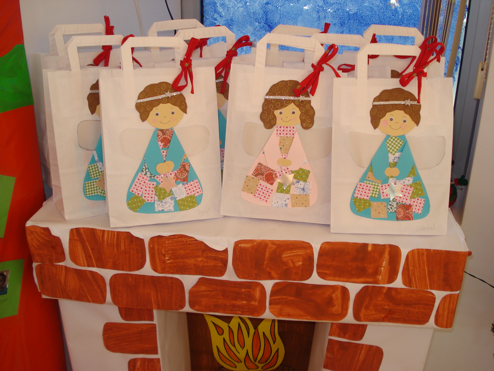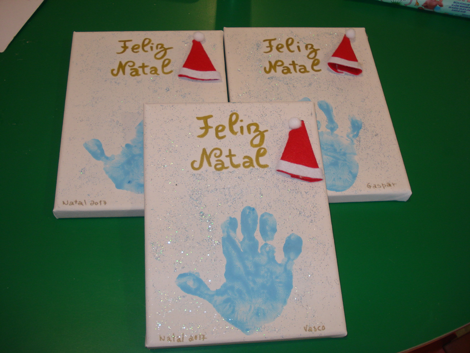 Para levar de prenda para casa, para oferecer aos nossos pais, fizemos uma moldura com a marca da mão, um saquinho com bolachas em tecido vermelho onde carimbamos um boneco de neve com esponjas e um postal com a foto de cada um e com a marca da nossa mão, todas estas prendas foram dentro de um saco de papel decorado com um anjo, cujo vestido foi decorado por nós, com colagem de pedacinhos de papel estampados. Para pôr dentro do saquinho vermelho fizemos bolachinhas de manteiga, às quais juntamos raspas de limão, estas tinham formas relativas ao natal, estrelas, sinos, coração, etc., esperamos que tenham sido do agrado dos papás, pois foram feitas com muito amor.