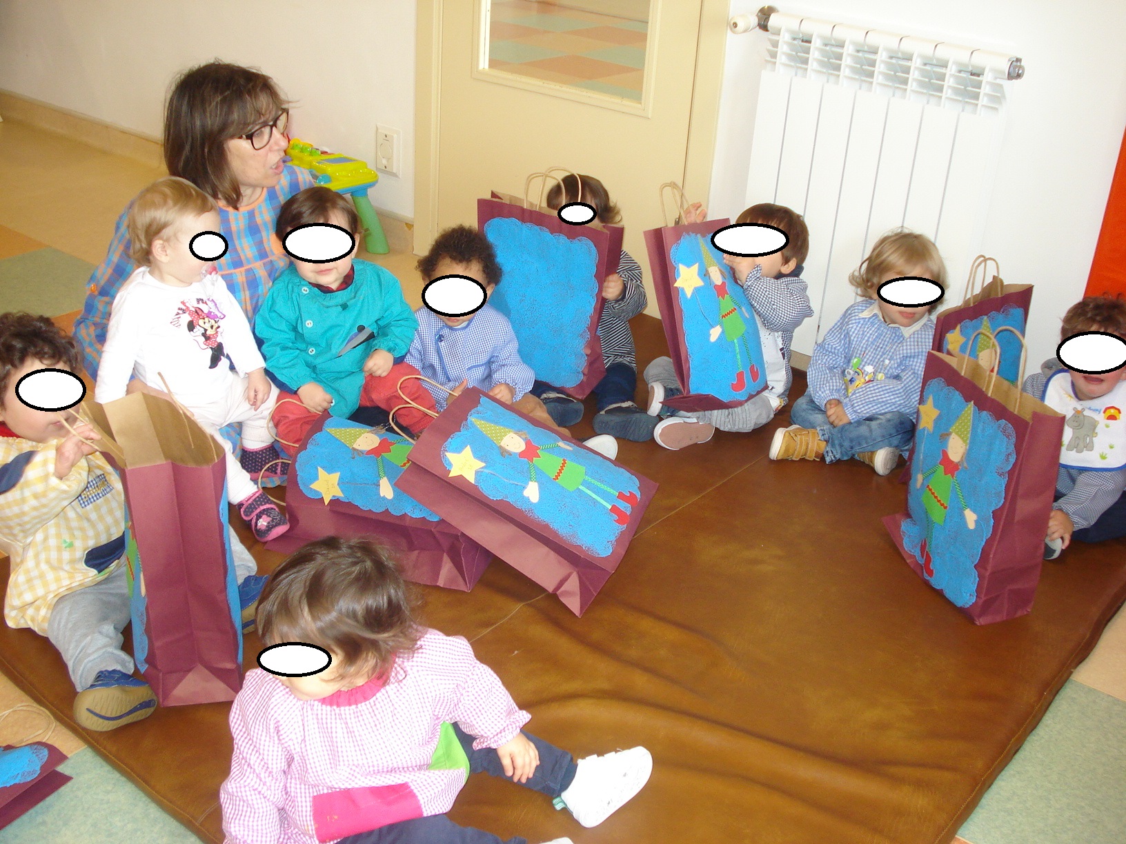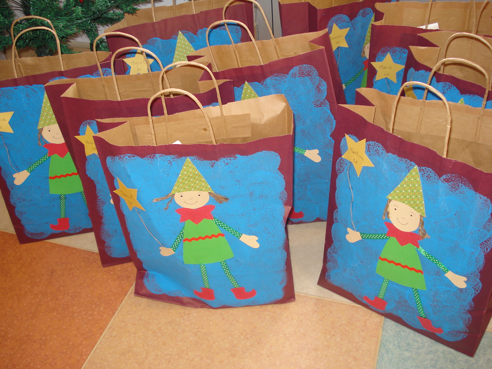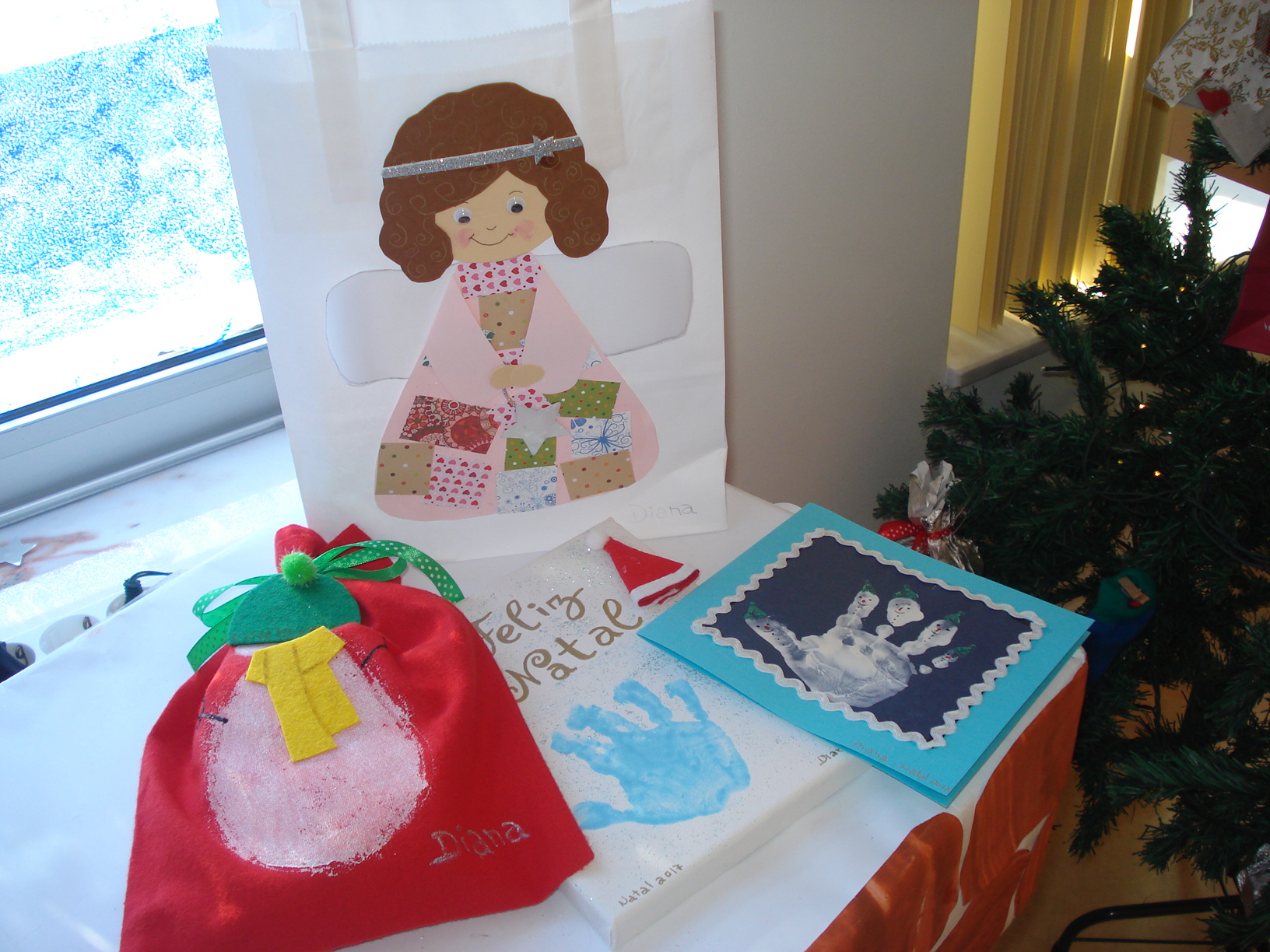 Para levar de prenda para casa, para oferecer aos nossos pais, fizemos uma moldura com a marca da mão, um saquinho com bolachas em tecido vermelho onde carimbamos um boneco de neve com esponjas e um postal com a foto de cada um e com a marca da nossa mão, todas estas prendas foram dentro de um saco de papel decorado com um anjo, cujo vestido foi decorado por nós, com colagem de pedacinhos de papel estampados. Para pôr dentro do saquinho vermelho fizemos bolachinhas de manteiga, às quais juntamos raspas de limão, estas tinham formas relativas ao natal, estrelas, sinos, coração, etc., esperamos que tenham sido do agrado dos papás, pois foram feitas com muito amor.