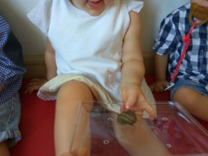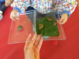 A educadora Denise trouxe ainda outras visitas, uns preguiçosos caracois, segundo as crianças estavam a dormir…