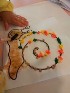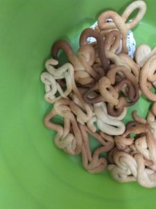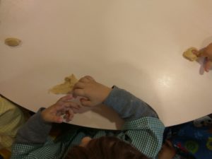No dia 16 de outubro, dia da alimentação, realizou-se o nosso mercadinho de Outono, na instituição. Para além da valiosa participação dos pais, também a nossa sala quis contribuir, e portanto fizemos raivas. Pudemos brincar com a massa e tentar fazer as “minhocas” necessárias para estes biscoitos.