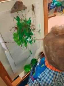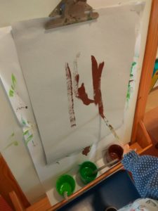Por fim pintámos em cavalete, algo que todos os elementos do grupo gostaram bastante. Dessa pintura recortamos uma folha para colar o caracol.