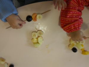 No dia da alimentação, e Daniela contou-nos uma história que gostamos bastante: A Lagartinha muito comilona. Como a história aborda muitas frutas, para a nossa sobremesa fizemos espetadas de frutas que cada criança trouxe de casa. Estavam uma delicia!
