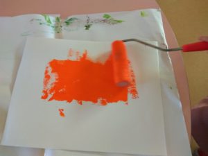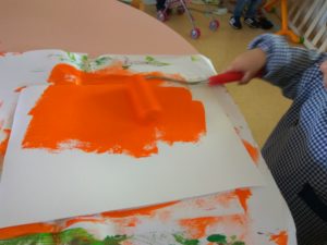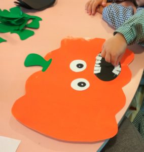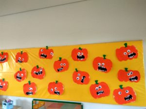 Com o dia das bruxas a chegar e com o interesse de algumas crianças por “coisas assustadoras”, fizemos umas abóboras. Pintámos uma cartolina com rolo e depois cada um colou os olhos, a boca e os dentes com pequenas orientações da Daniela. Ficaram não diria assustadoras, mas muito engraçadas.
