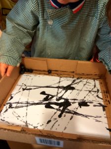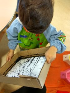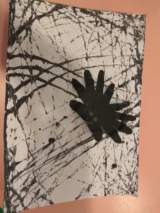 Ainda com a temática dos animais, pintámos uma teia com a técnica do berlinde, e depois com as nossas mãos fizemos umas aranhas.