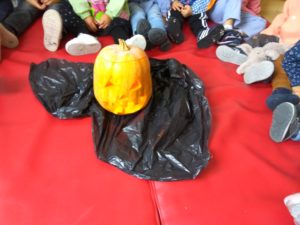 No dia 31, a Cristina trouxe uma abóbora de verdade e estivemos a decorá-la. A meio da manhã fomos ao salão, onde nos reunimos com as crianças do pré escolar para receber os idosos do Lar Amália Madaíl, que vieram pedir o pão por Deus. Cantámos uma canção e cada grupo também ofereceu algo especial. Foi um bocadinho de manhã bem passada em grande companhia.