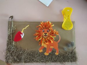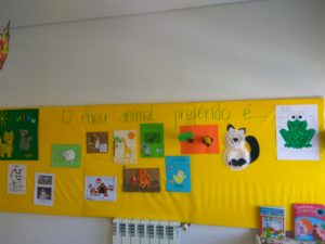 Pois bem, não podíamos ter começado melhor. A educadora Daniela propos aos pais um desafio: de algum modo apresentarem o animal preferido do seu filho, num trabalhinho, para depois expormos na sala. Foram todos muito originais. A nossa M. trouxe um trabalhinho com um pequeno gravador, que depois utilizamos para a exploração dos diferentes sons dos animais, emitidos pelas crianças que quisessem, e foi mesmo divertido.