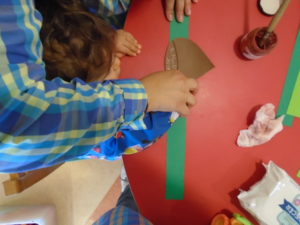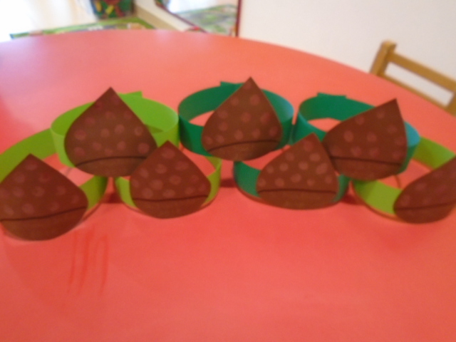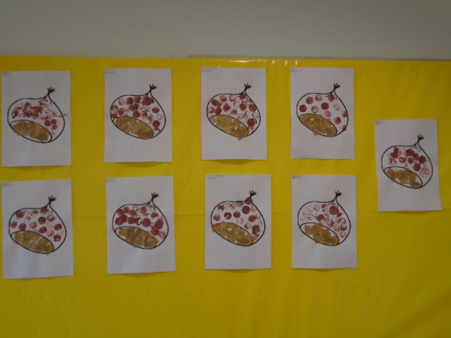 Com a chegada do dia de S. Martinho preparámos uma coroa para levarmos para casa. Também fizemos carimbagem com uma rolha para pintar uma castanha e colamos papel de seda.