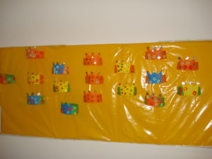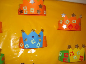 Neste mês de Janeiro começamos por festejar “Os Reis”, começamos a falar dos reis Magos que tinham ido visitar o Menino Jesus guiados por uma estrela, e lhe levaram presentes preciosos, então resolvemos ser reis e construímos uma coroa, na qual colamos estrelas, corações, etc, fizemos também um chocalho com rolhas e aprendemos a canção” Nós, somos os três reis…”.