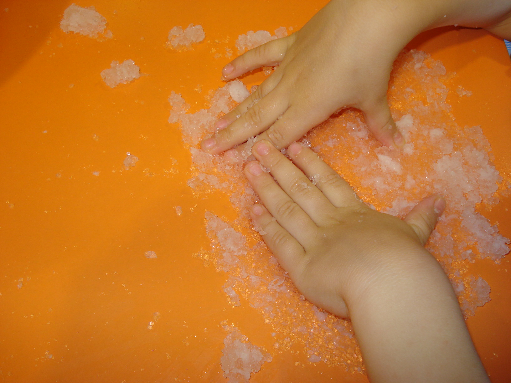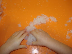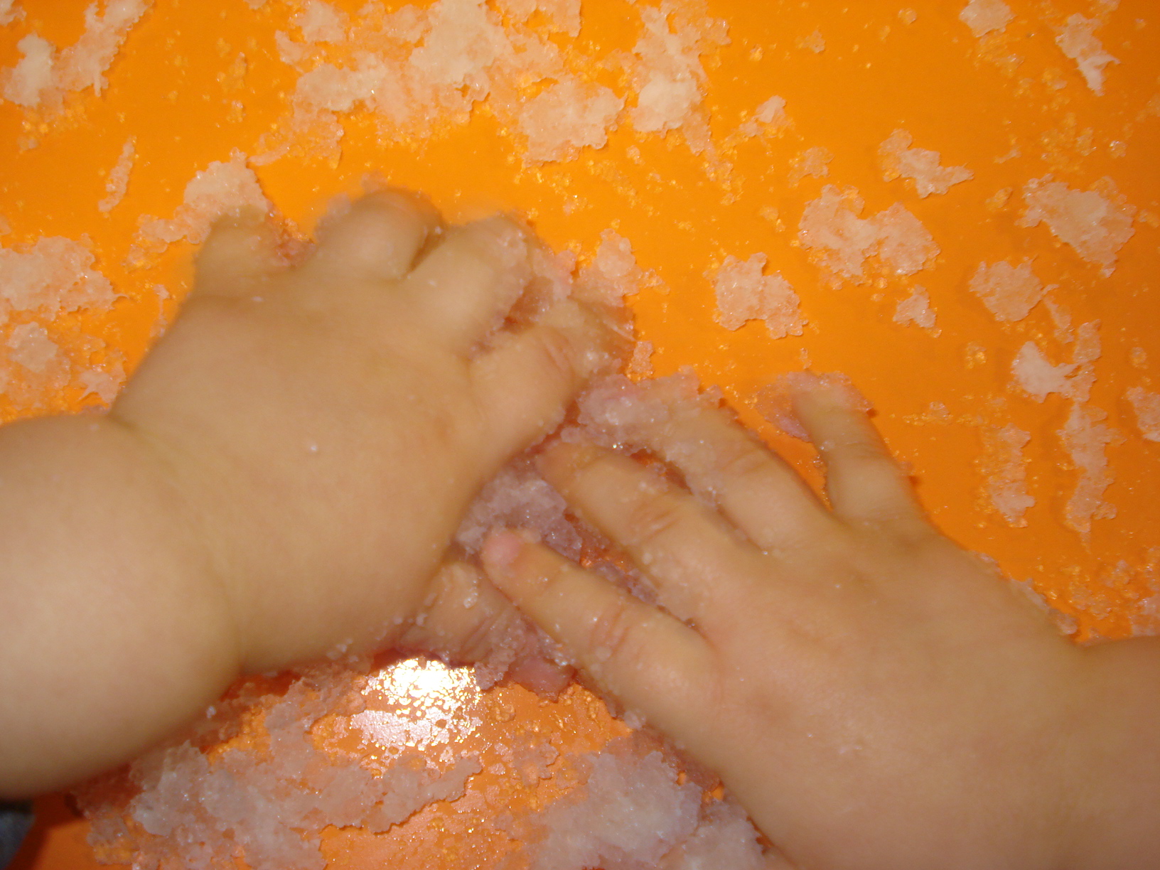 A Educadora Daniela hidratou enchimento de fraldas e depois dos meninos da sua sala terem explorado, cedeu-nos e foi a nossa vez de explorar este material que parecia neve, com o qual brincamos, fizemos bolas, espalmamos, esprememos, atiramos, e divertimo-nos, no final a sala ficou em mau estado…