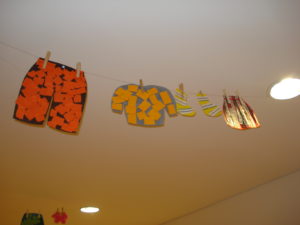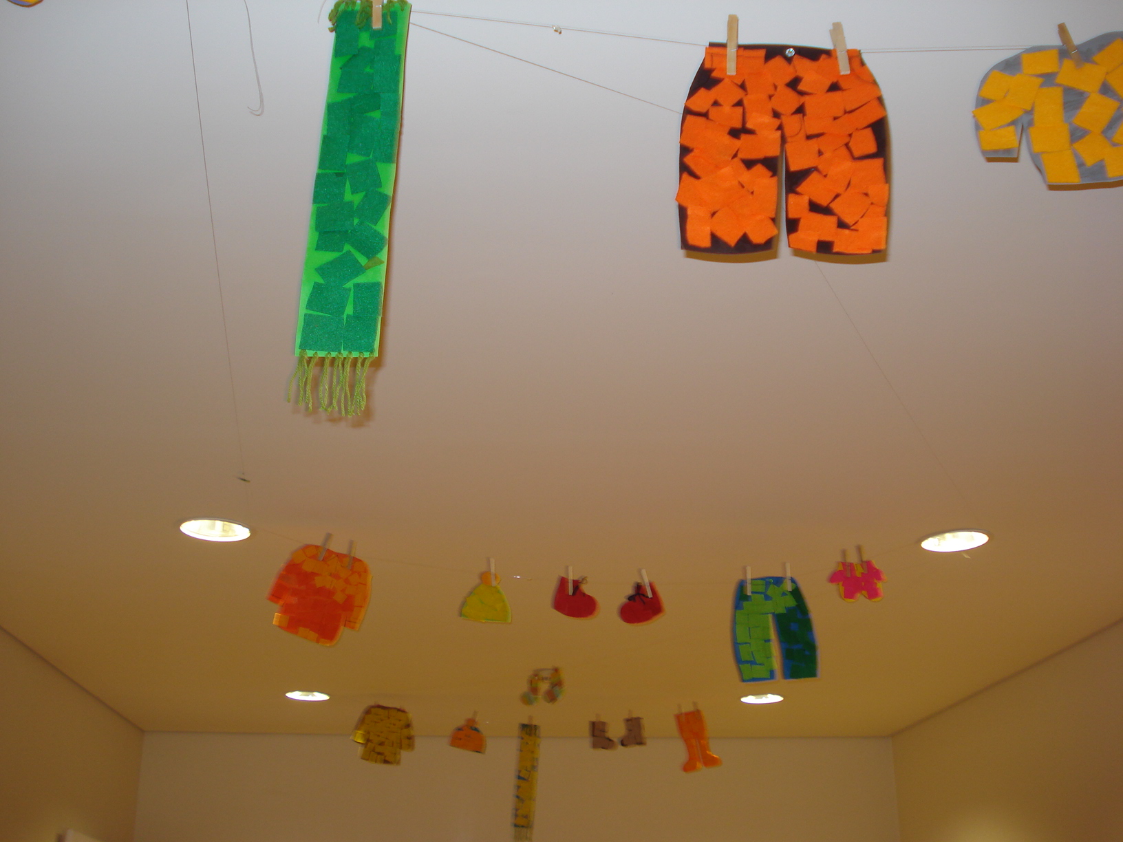 Depois, fizemos um estendal de roupa quentinha na qual colamos quadrados de tecidos.