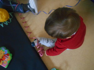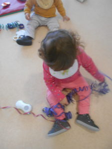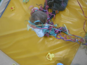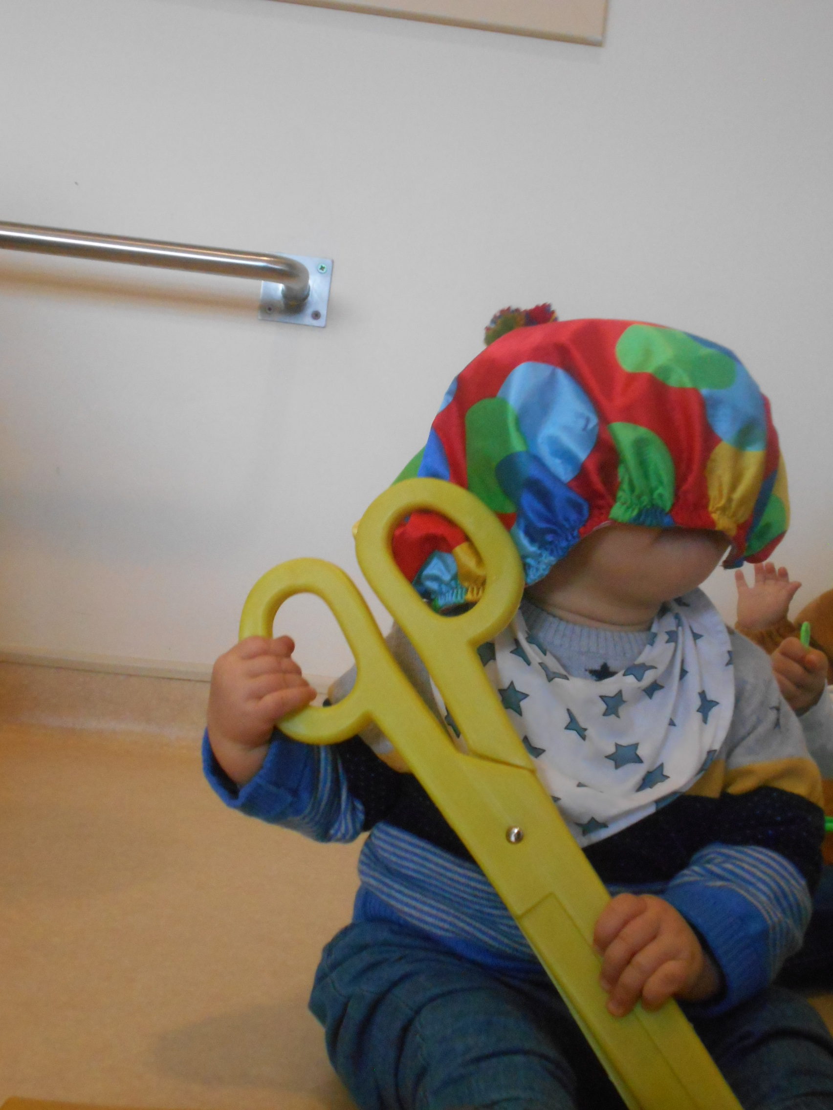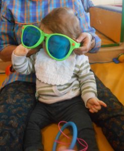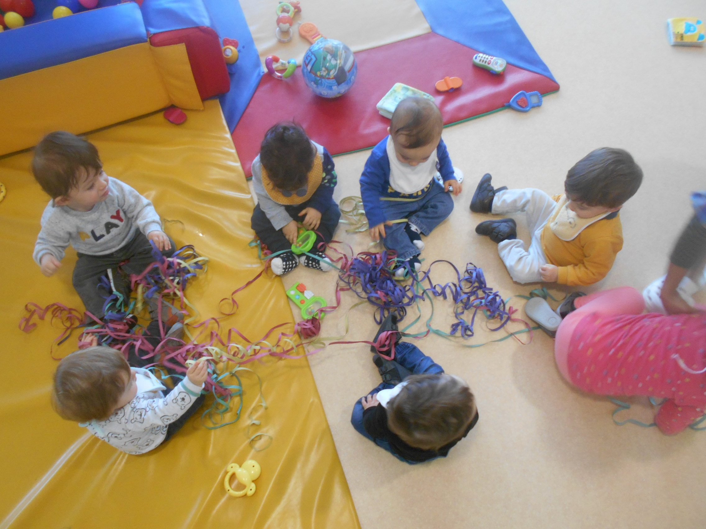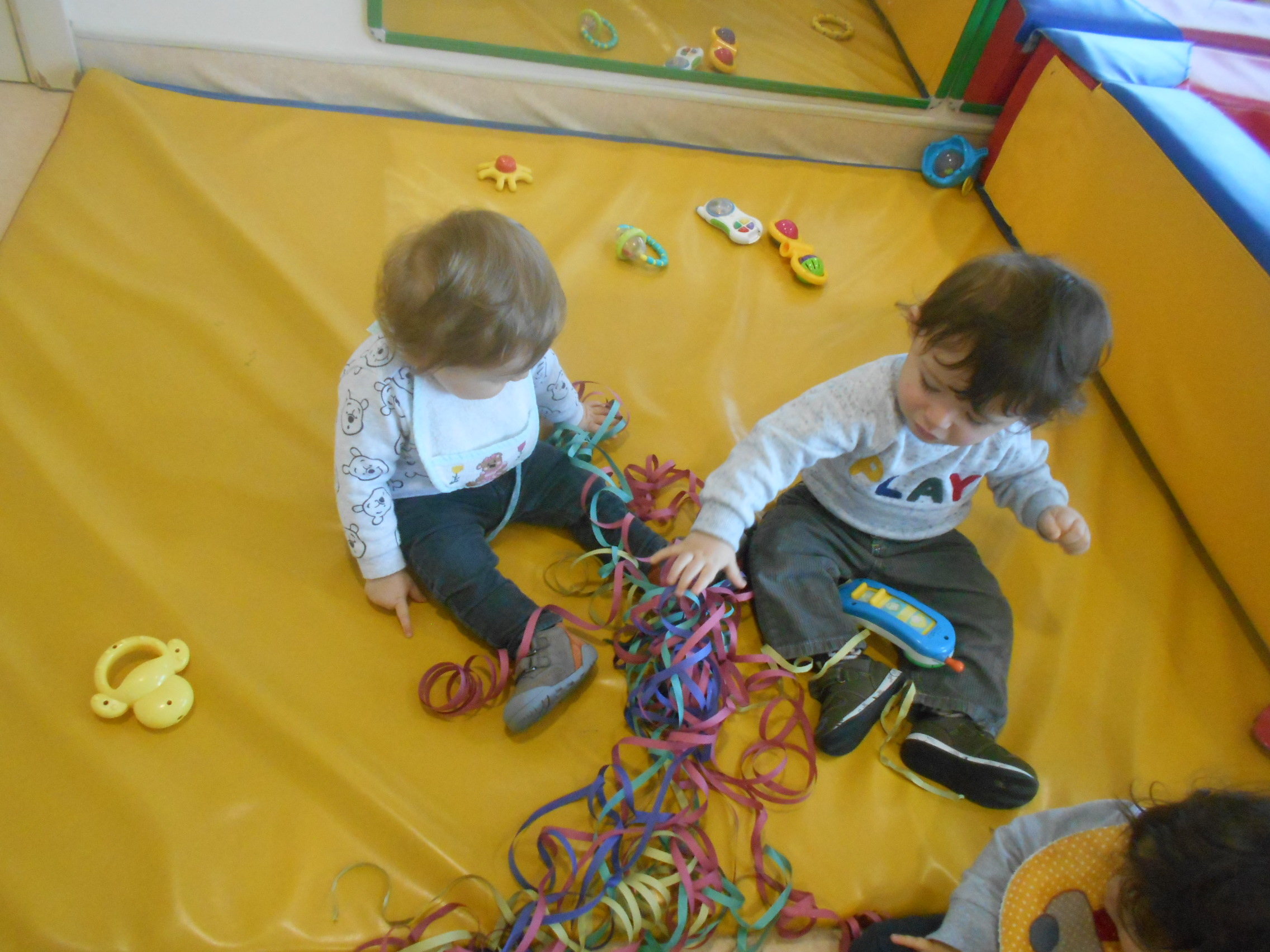Começou com muitas maluquices nas brincadeiras de carnaval, pois a Cláudia trouxe-nos serpentinas, atirou-as por cima de nós enquanto estávamos distraídos a brincar com os brinquedos da sala e depois deixou-nos explorá-las livremente. Também nos trouxe pequenos acessórios de disfarces carnavalescos que nós andámos a experimentar… Foi muito giro, ora vejam lá…